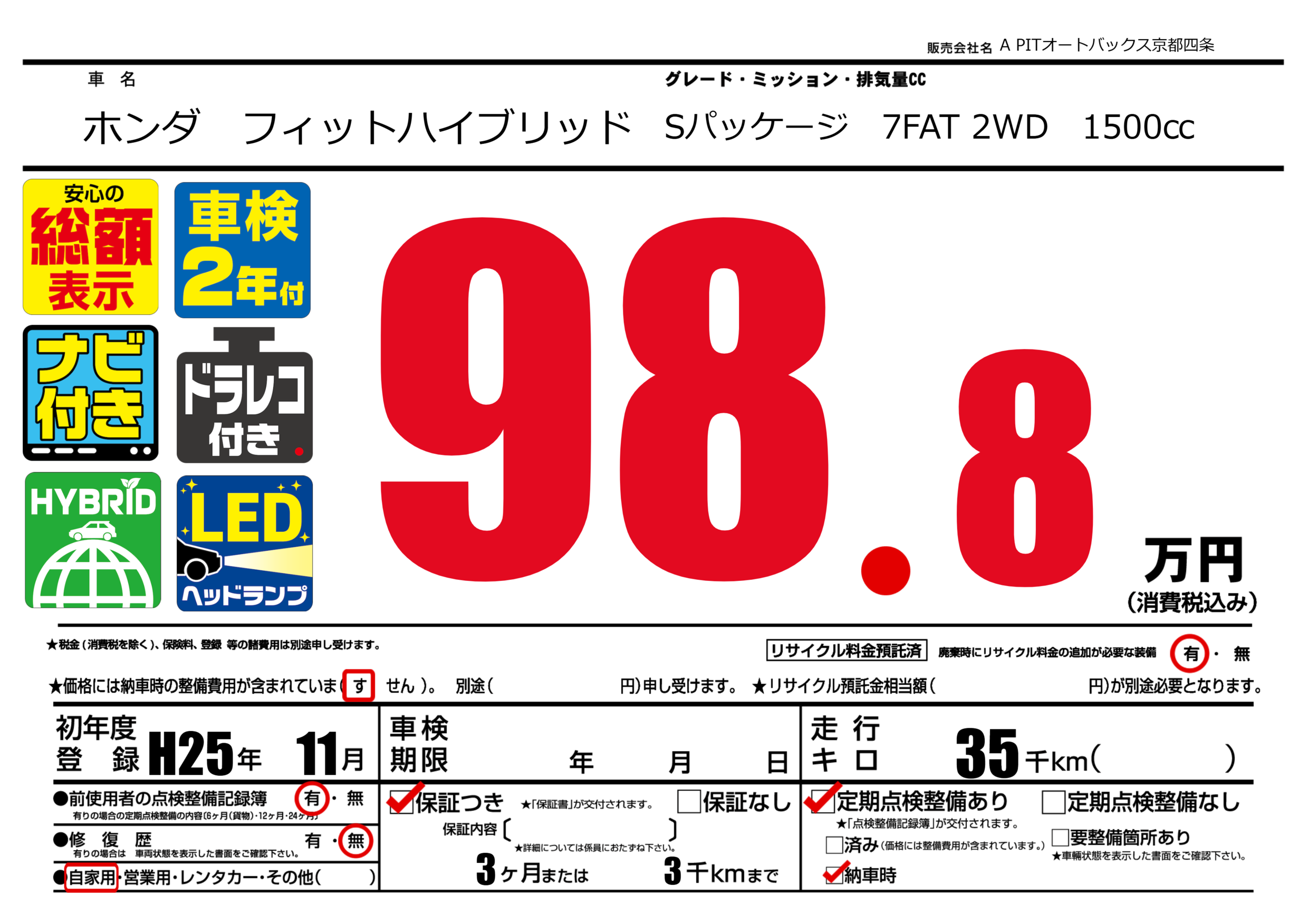 | 走行キロ | 3.5万km | 初年度登録 | H25年11月 |