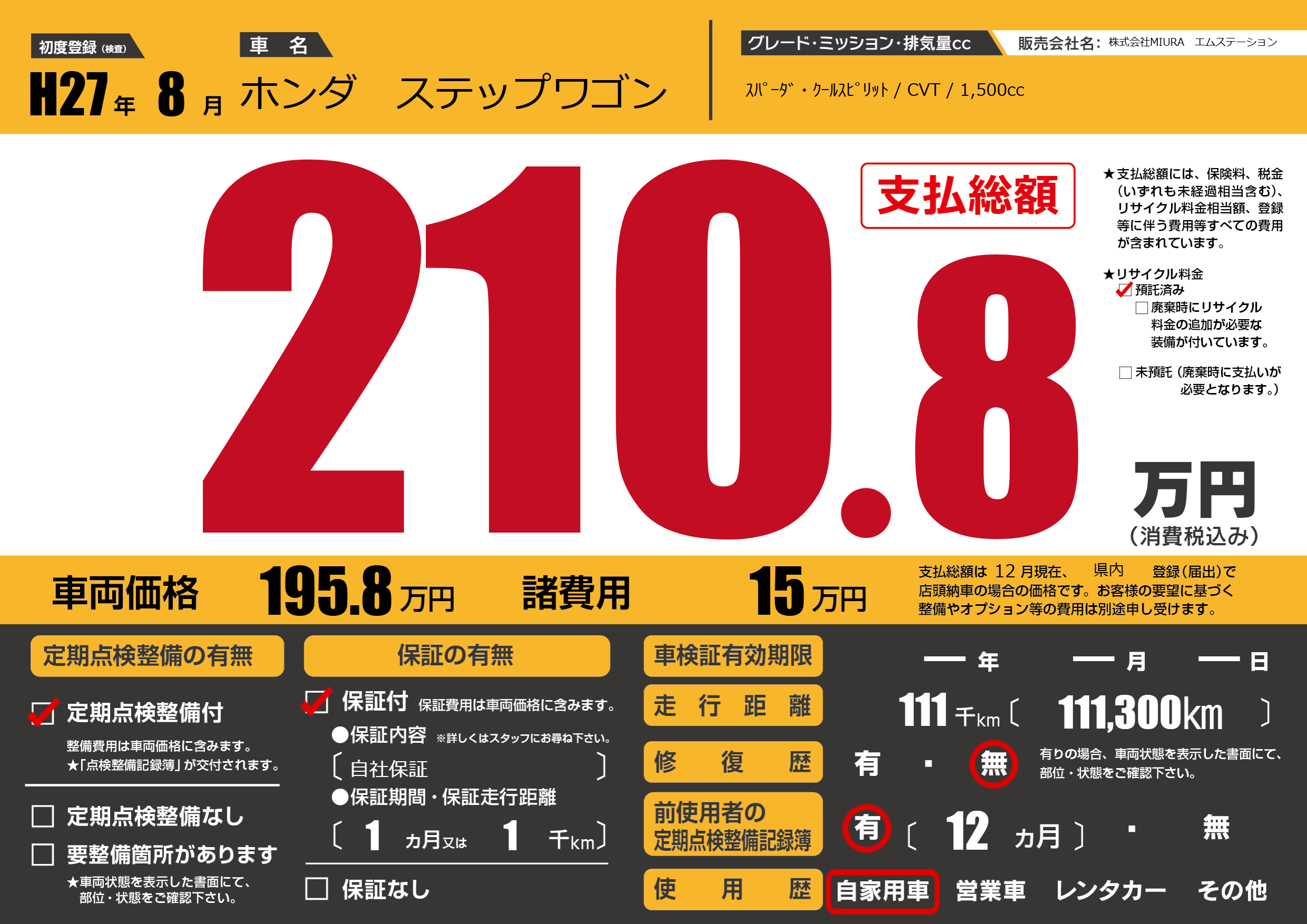 | 走行キロ | 11.1万km | 初年度登録 | H27年8月 |
