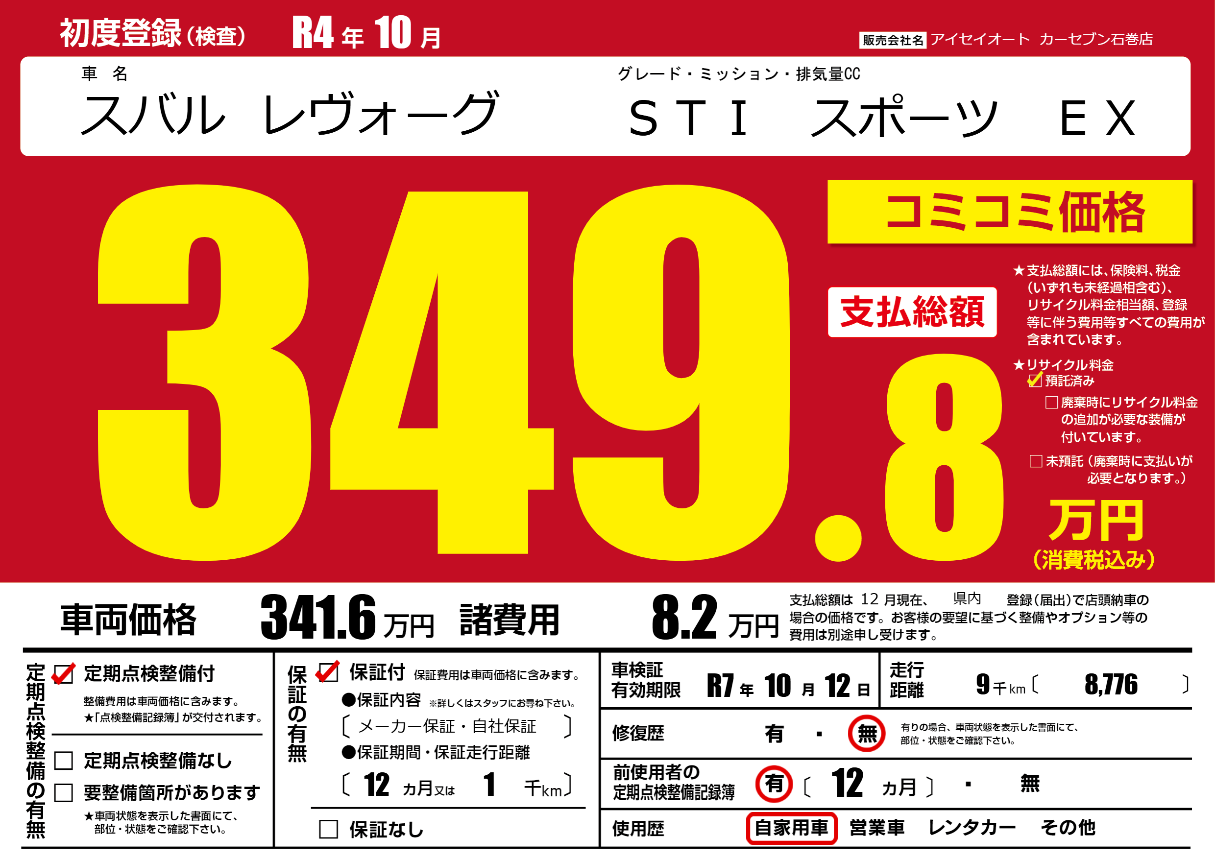 | 車名 | スバル レヴォーグ | グレード ミッション 排気量 |