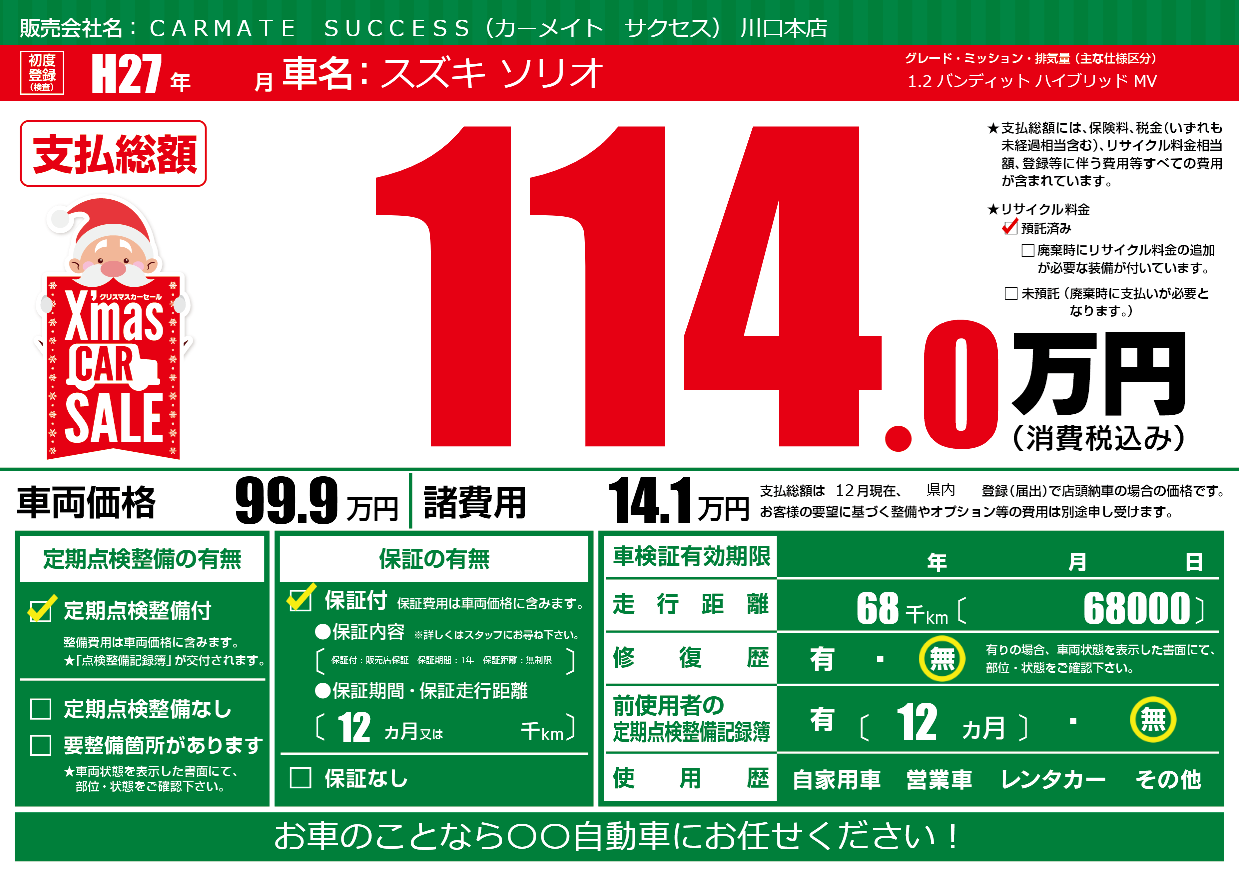 | 車名 | スズキ ソリオ | グレード ミッション 排気量 |
