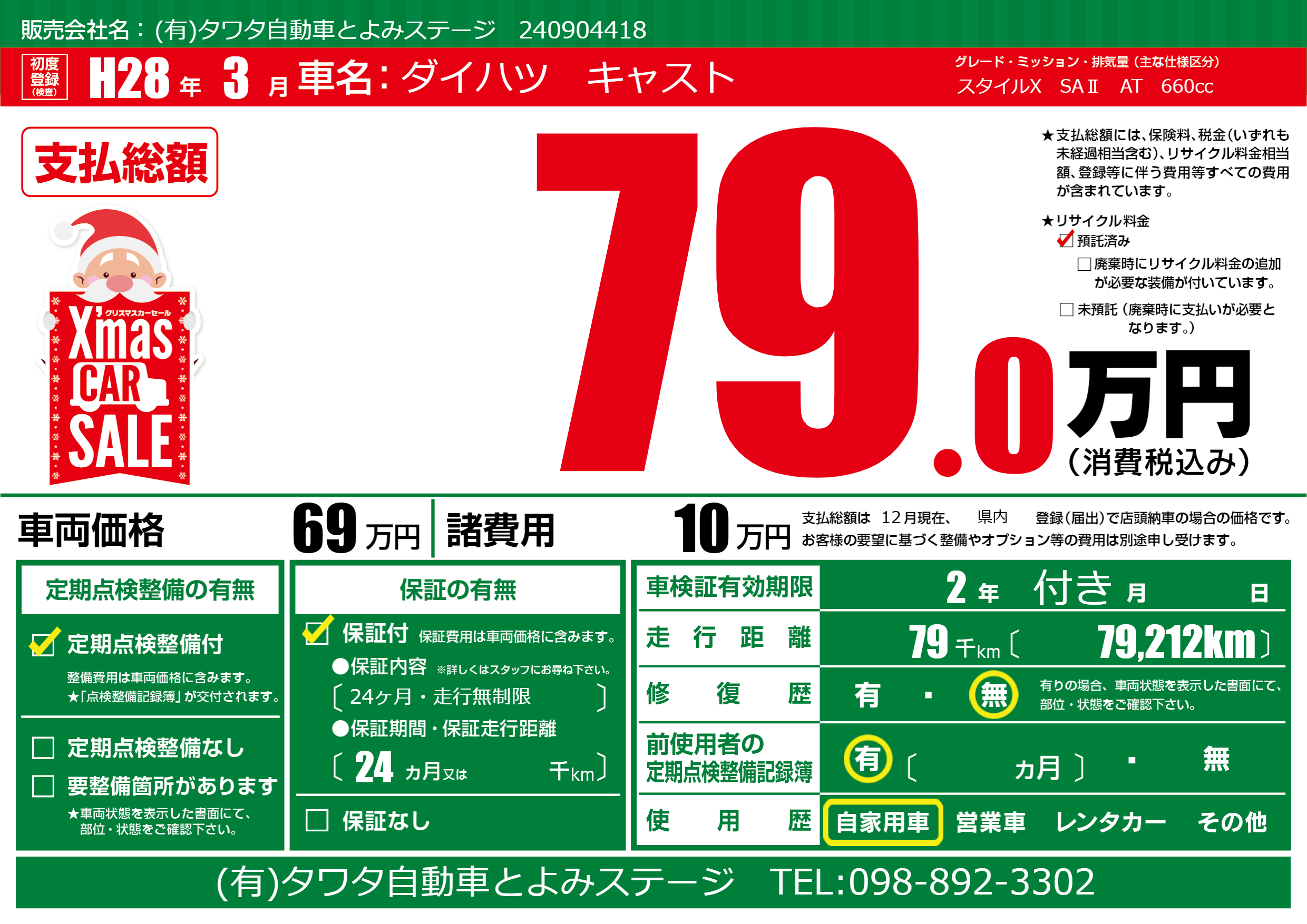 | 車名 | ダイハツ キャスト | グレード ミッション 排気量 |