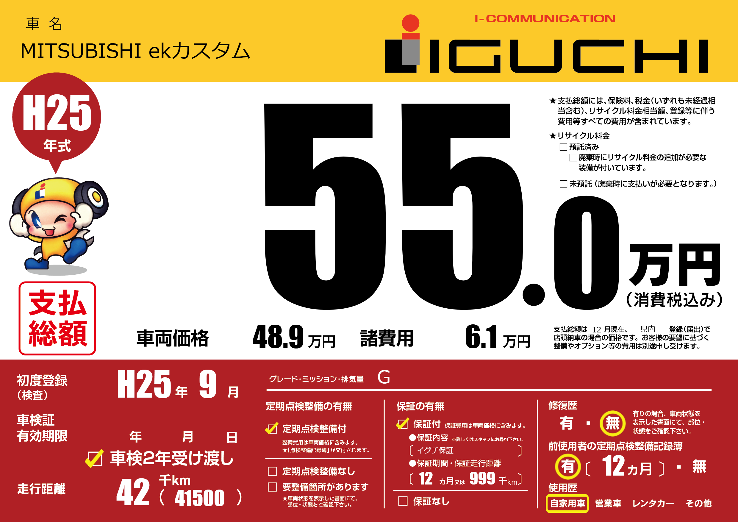 | 車名 | MITSUBISHI ekカスタム | グレード ミッション 排気量 |