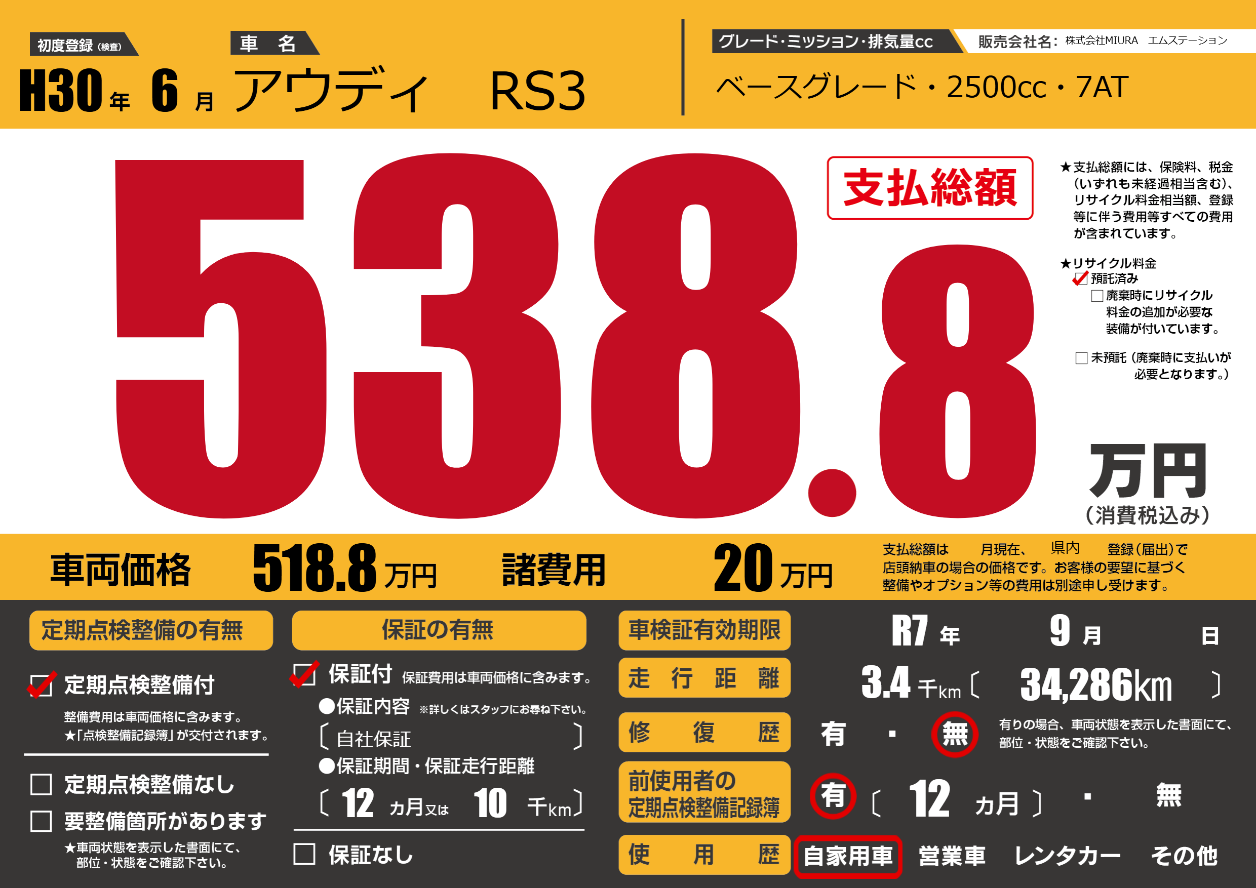 | 車名 | アウディ RS3 | グレード ミッション 排気量 |