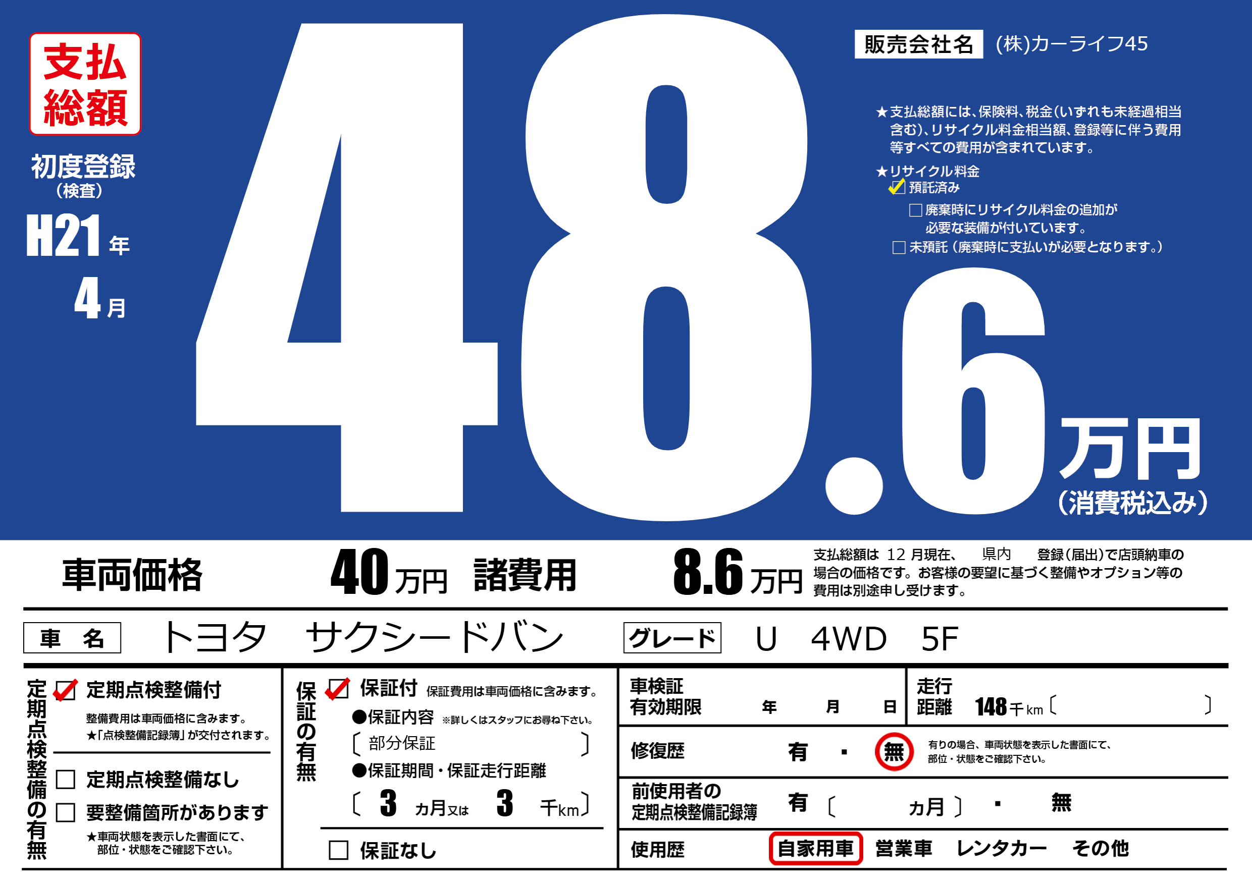 | 走行キロ | 14.8万km | 初年度登録 | H21年4月 |