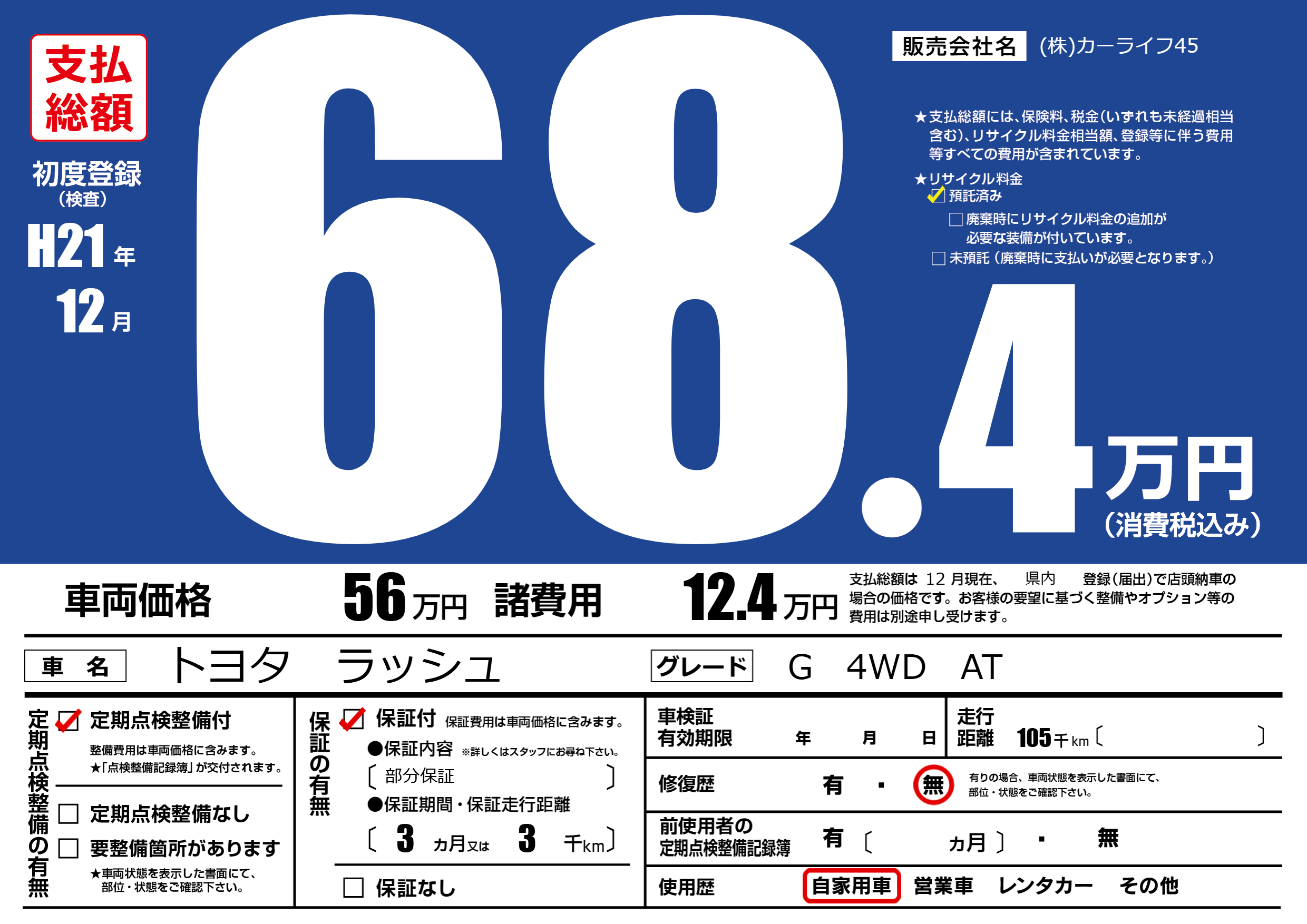 | 走行キロ | 10.5万km | 初年度登録 | H21年12月 |