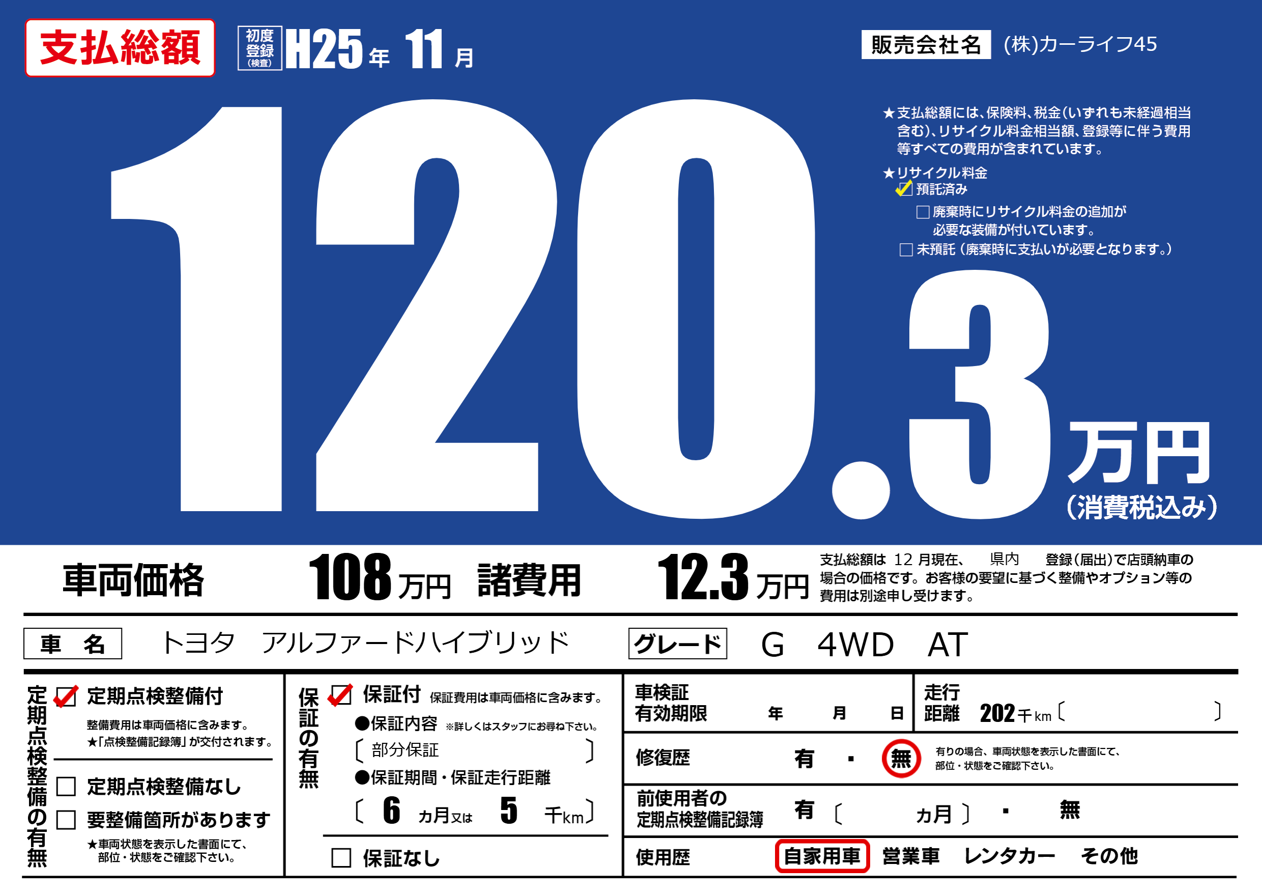 | 走行キロ | 20.2万km | 初年度登録 | H25年11月 |