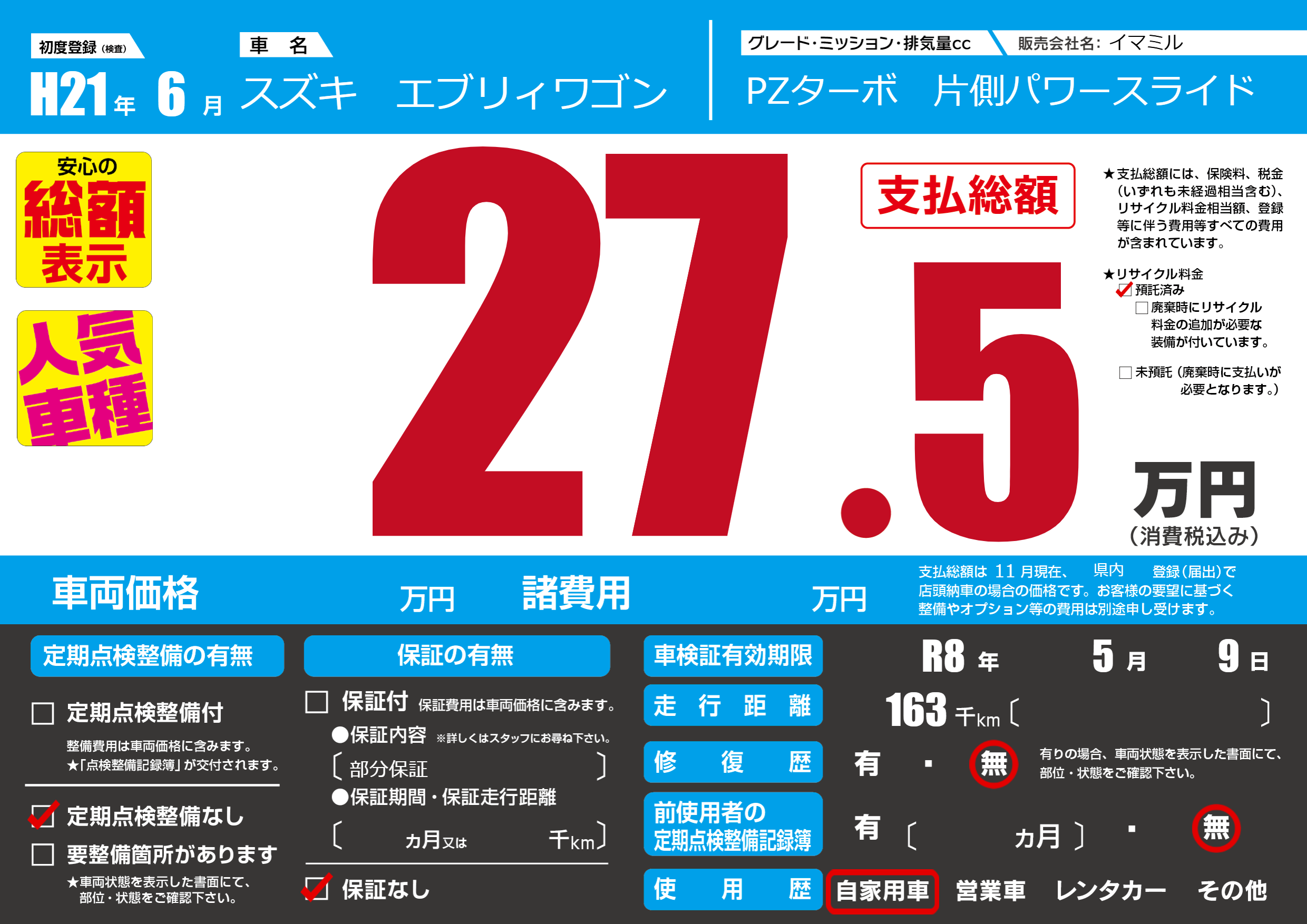 | 走行キロ | 16.3万km | 初年度登録 | H21年6月 |
