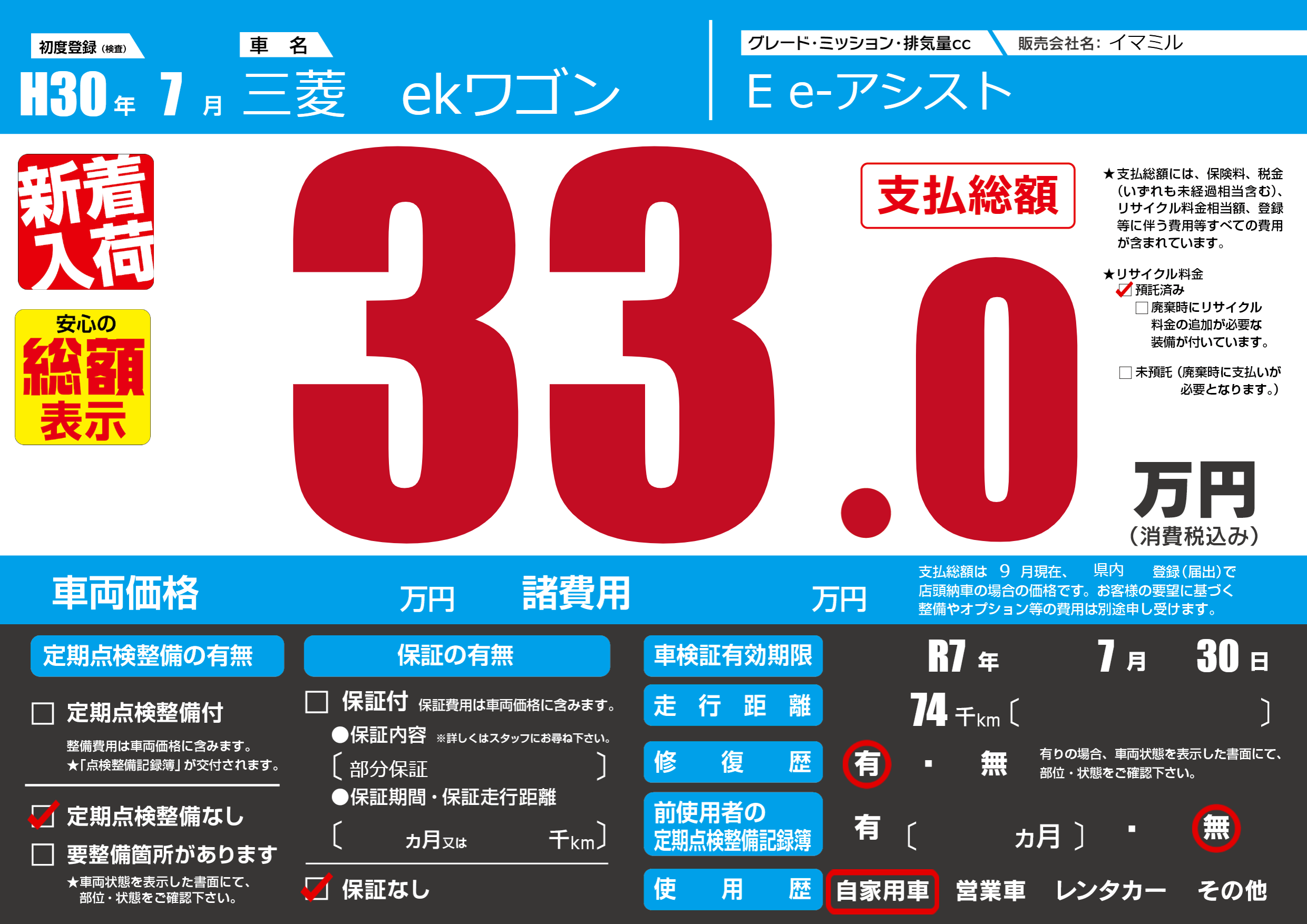 | 走行キロ | 7.4万km | 初年度登録 | H30年7月 |