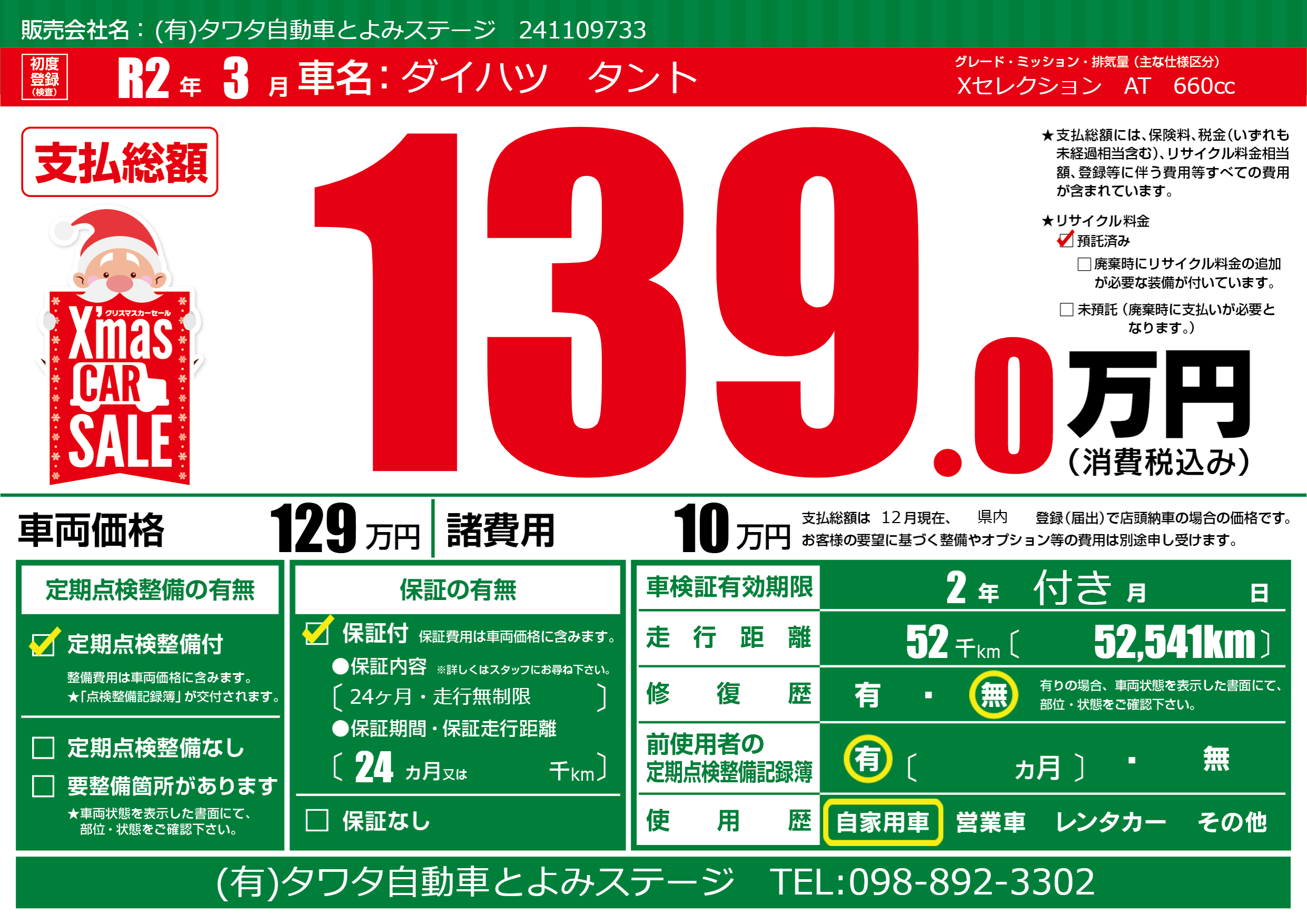 | 車名 | ダイハツ タント | グレード ミッション 排気量 |