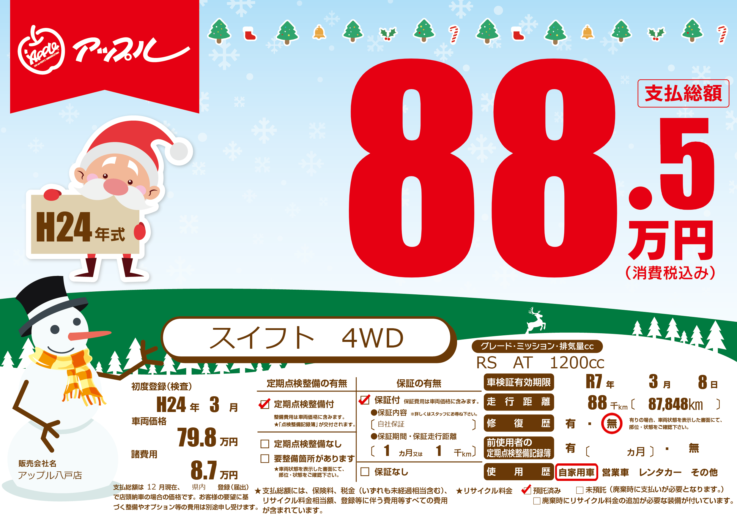 | 車名 | スイフト 4WD | グレード ミッション 排気量 |