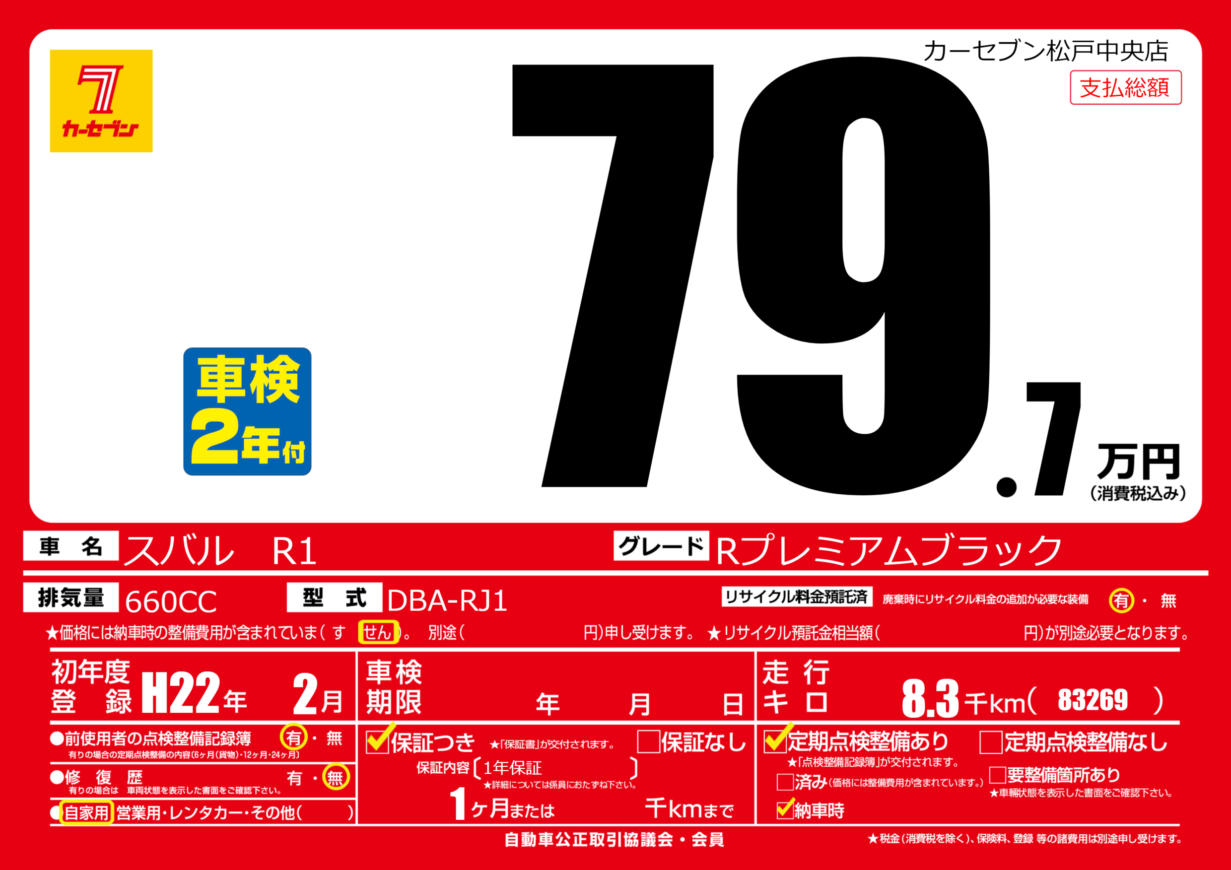 | 車名 | スバル R1 | グレード ミッション 排気量 |