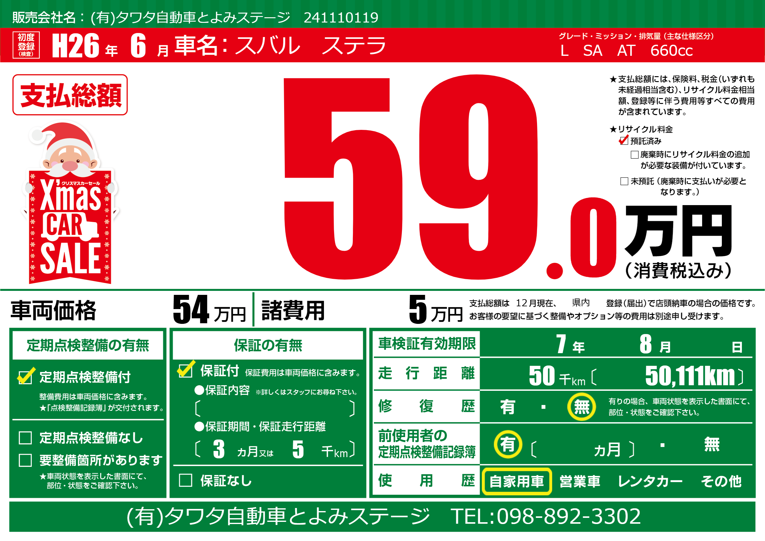| 車名 | スバル ステラ | グレード ミッション 排気量 |