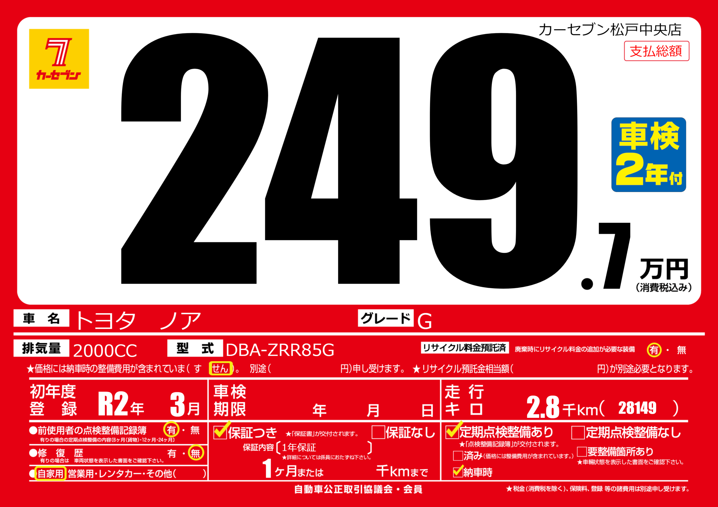 | 車名 | トヨタ ノア | グレード ミッション 排気量 |