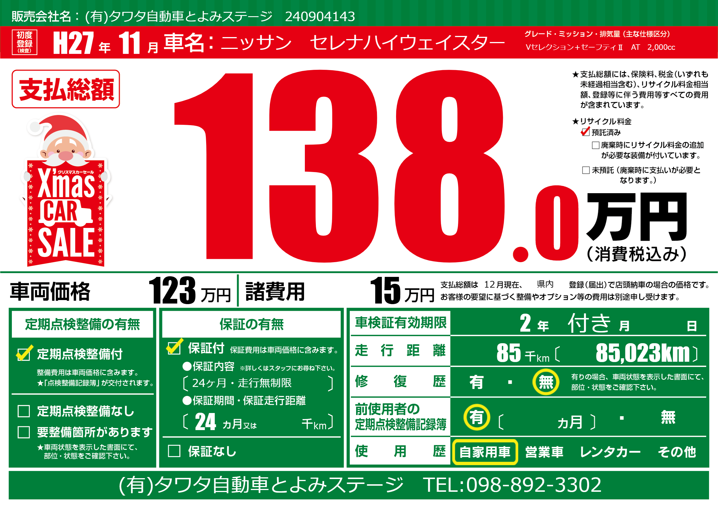 | 走行キロ | 8.5万km | 初年度登録 | H27年11月 |