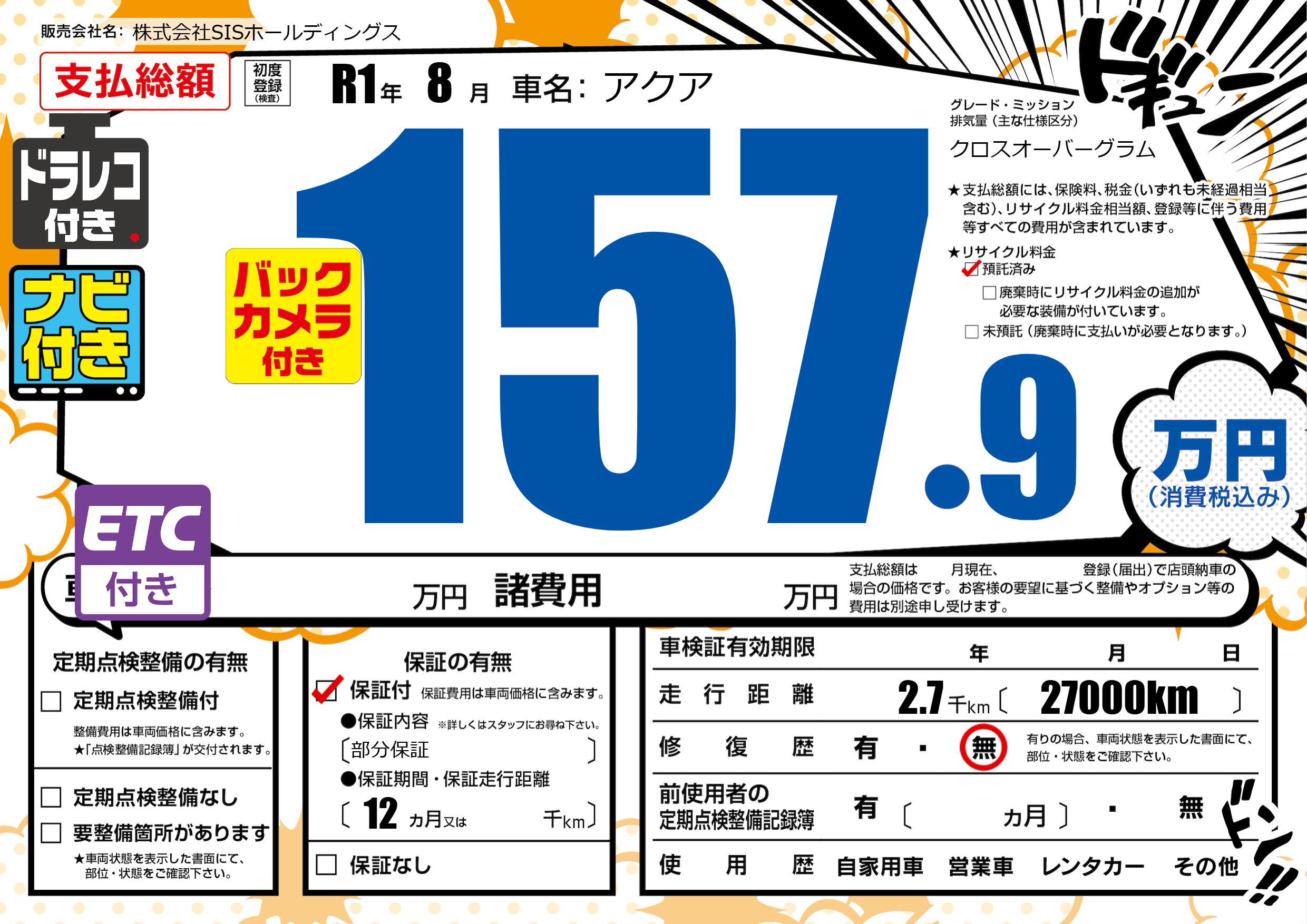 | 走行キロ | 0.2万km | 初年度登録 | R1年8月 |
