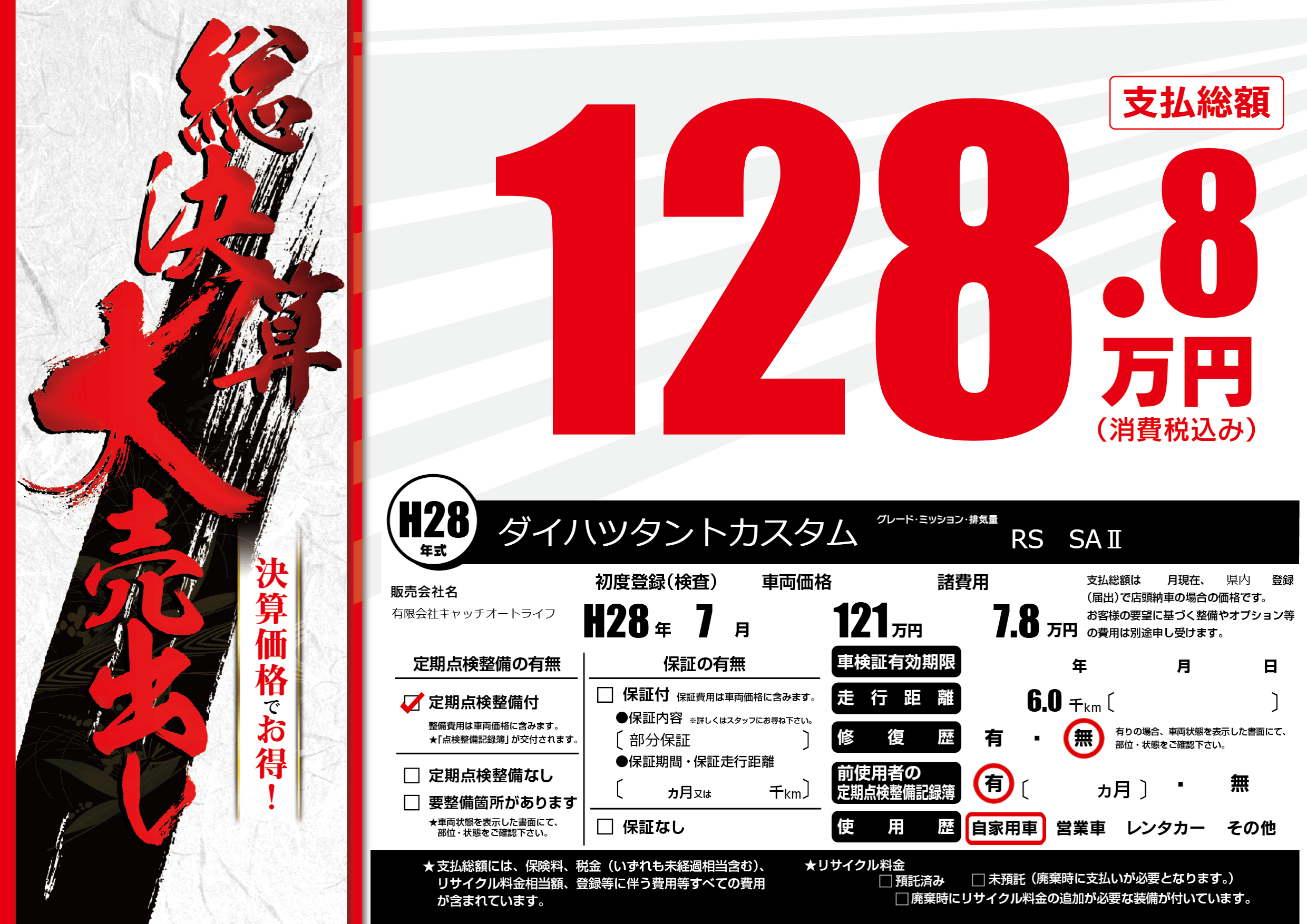 | 車名 | ダイハツタントカスタム | グレード ミッション 排気量 |