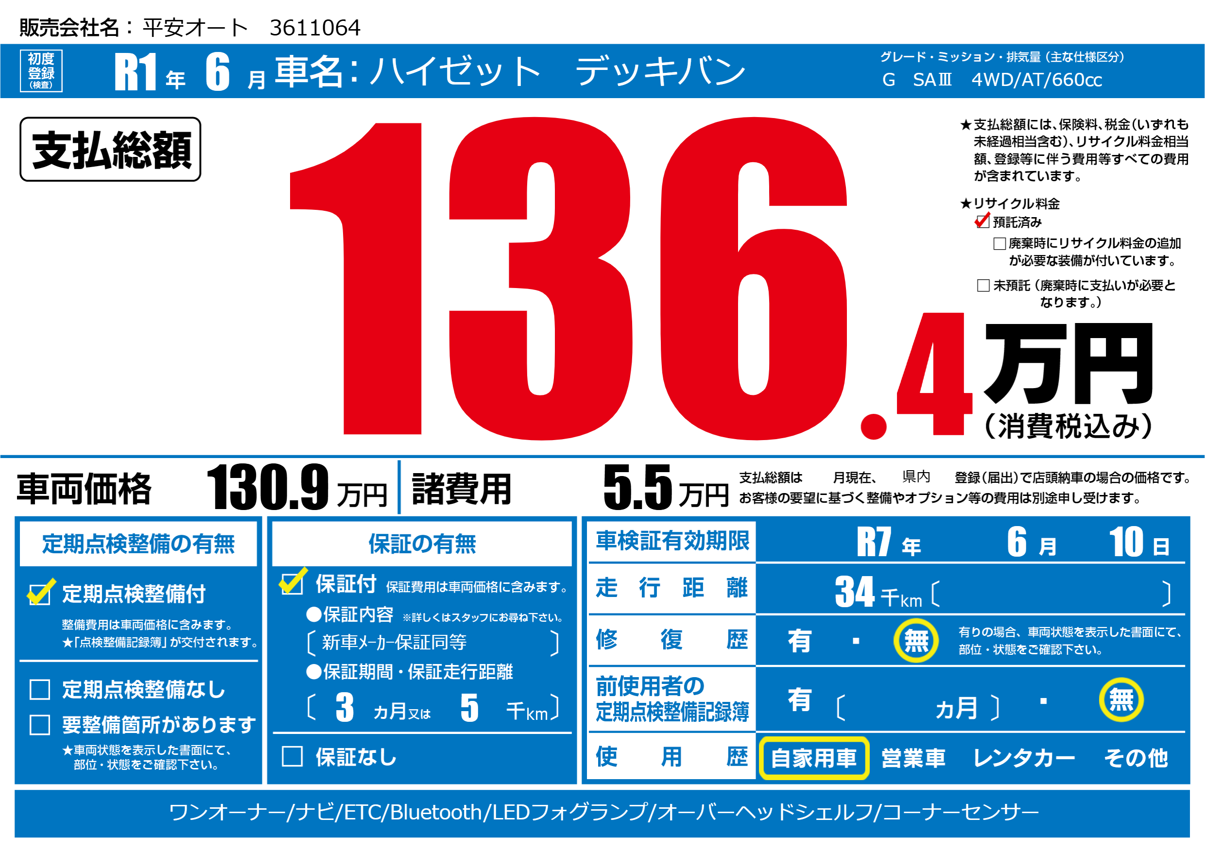 | 車検制限 | R7年 6月 10日 | ||