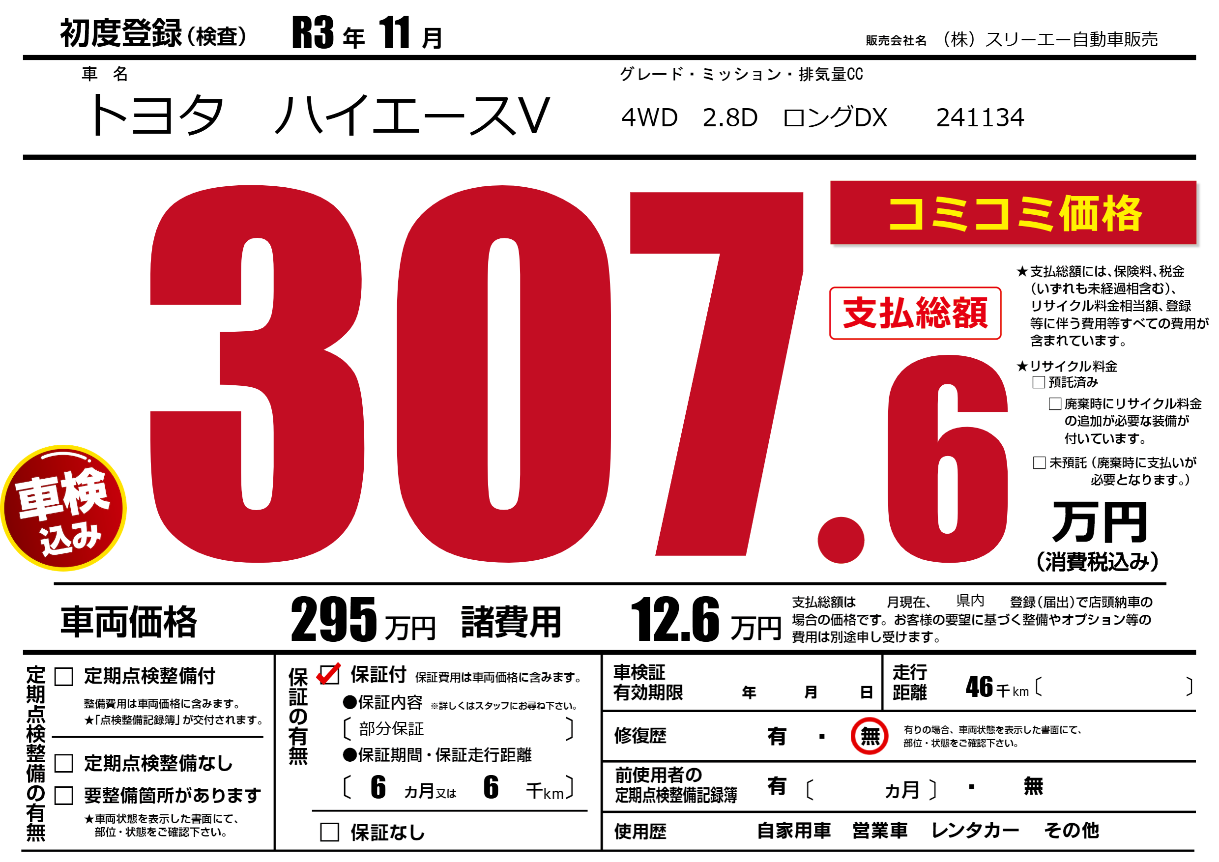 保証付き 保証内容(部分保証) 6ヶ月または(6)千kmまで |