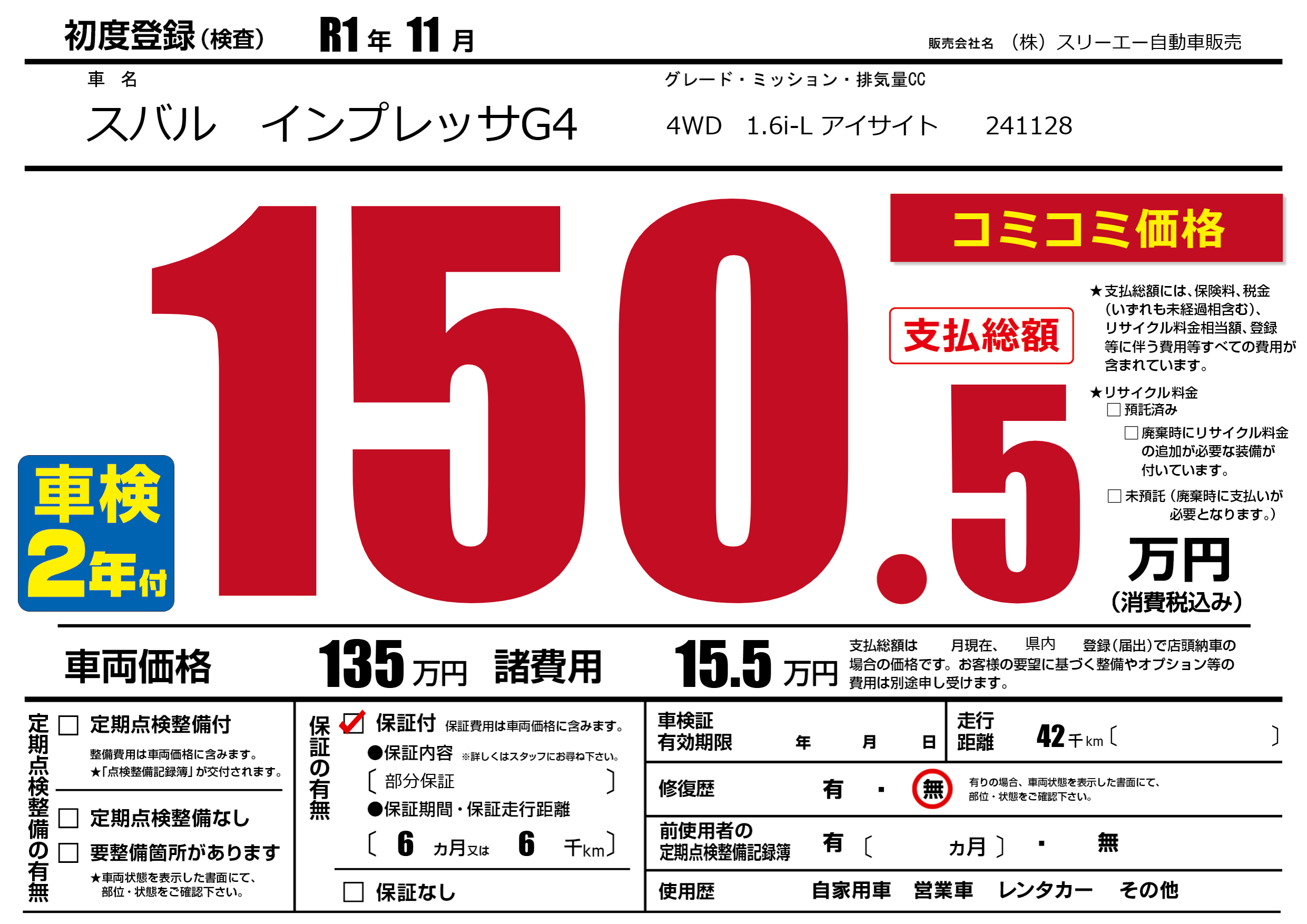 | 車名 | スバル インプレッサG4 | グレード ミッション 排気量 |