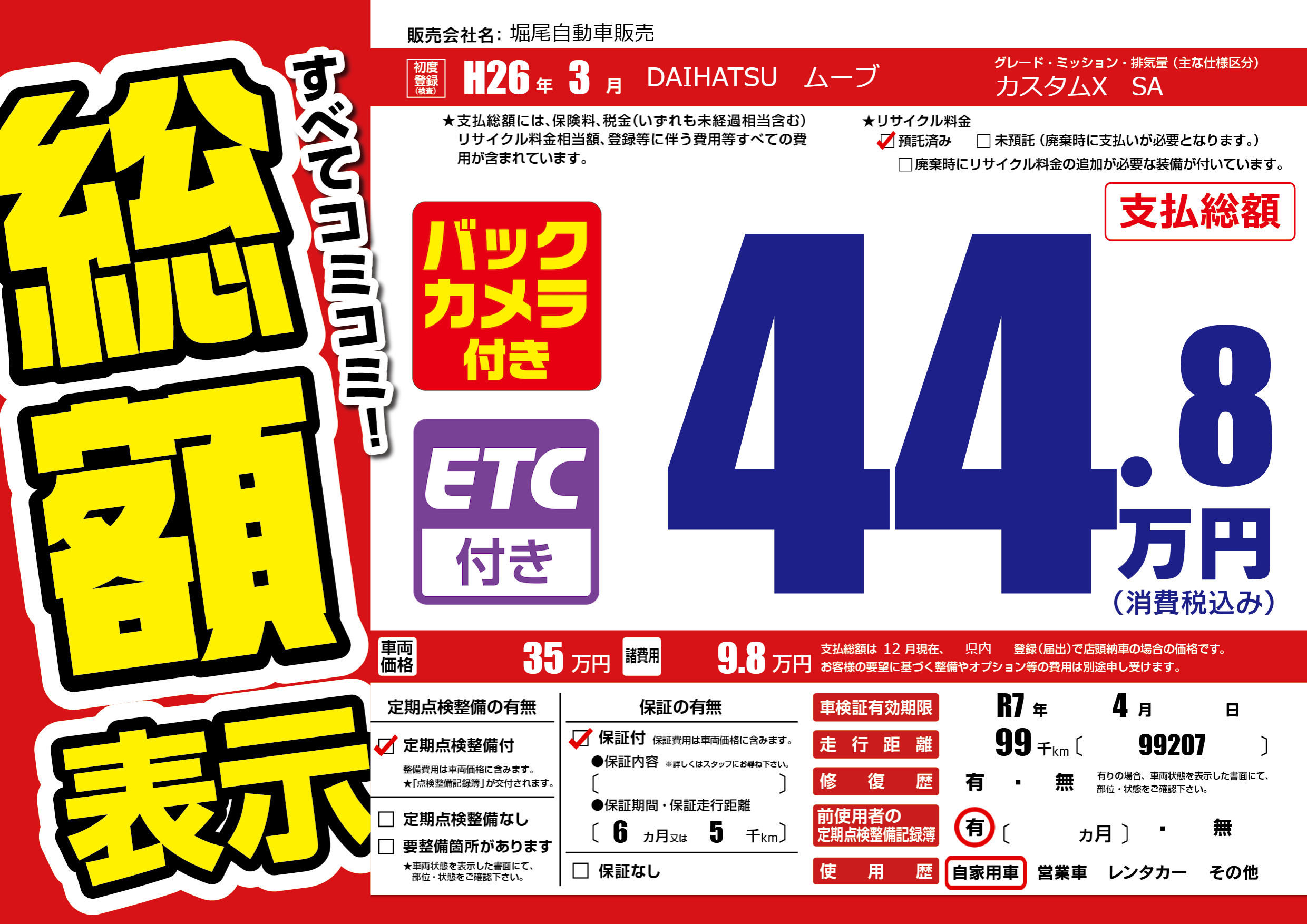 | 車検制限 | R7年 4月 - 日 | ||