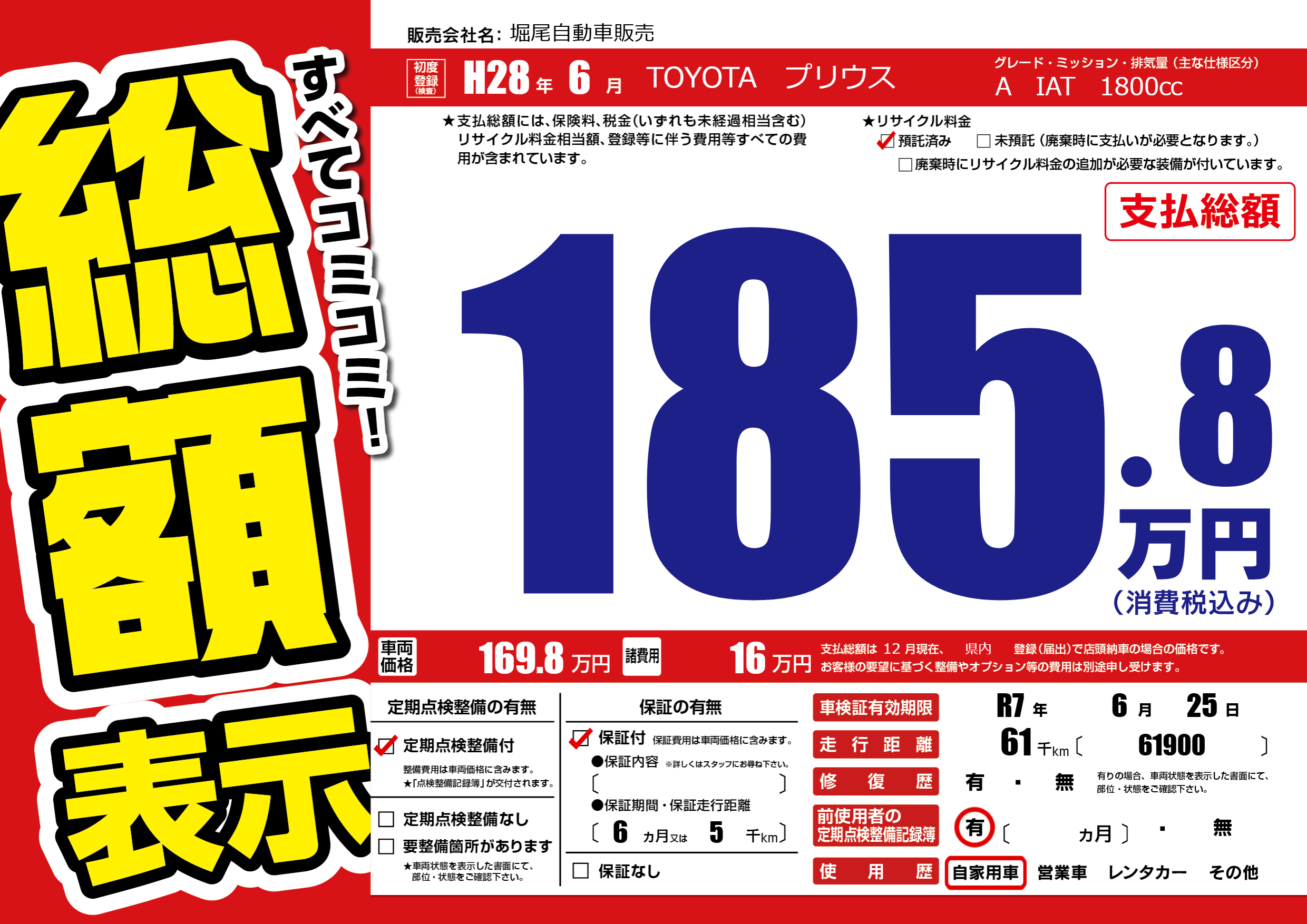 | 車名 | TOYOTA プリウス | グレード ミッション 排気量 |