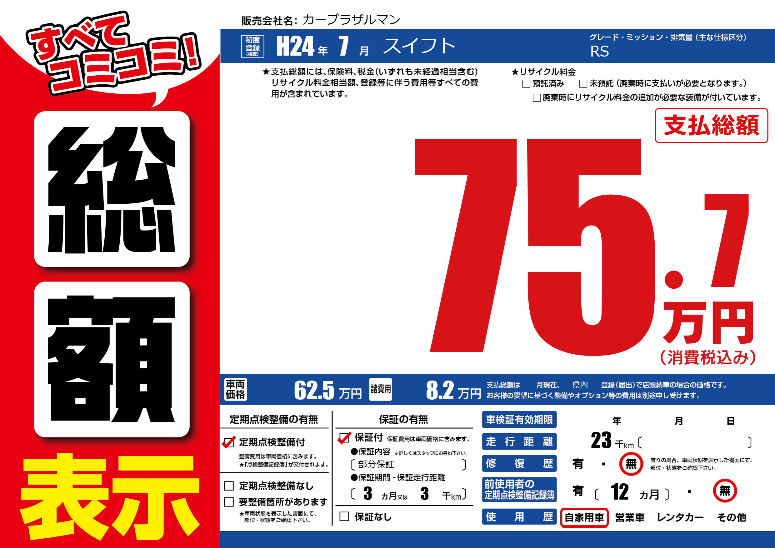 | 車名 | スイフト | グレード ミッション 排気量 |