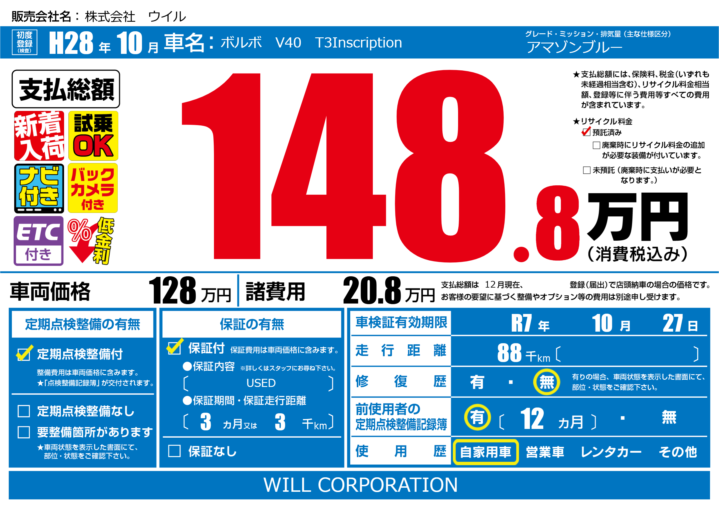 | 車名 | ボルボ V40 T3Inscription | グレード ミッション 排気量 |