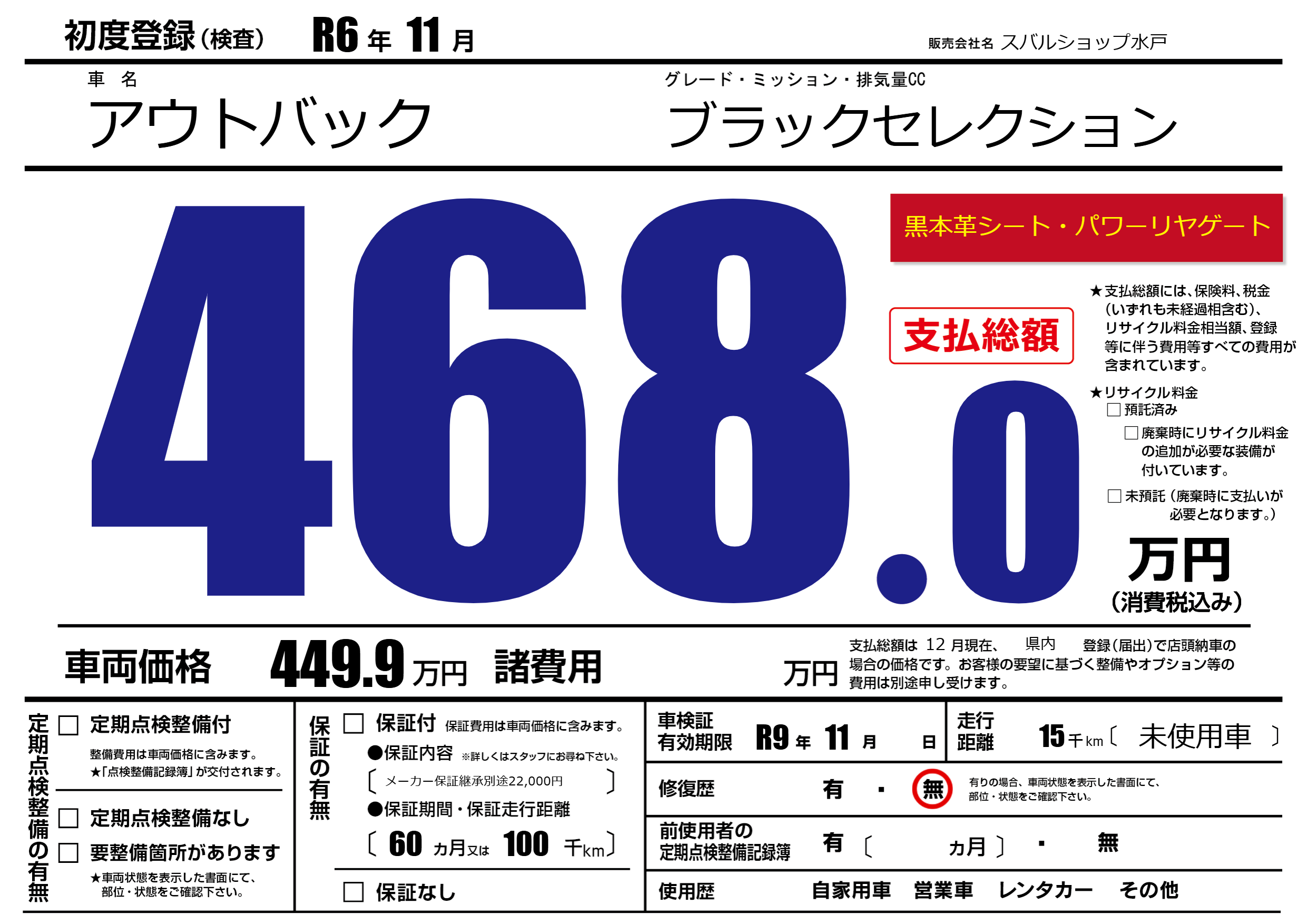 | 車名 | アウトバック | グレード ミッション 排気量 |