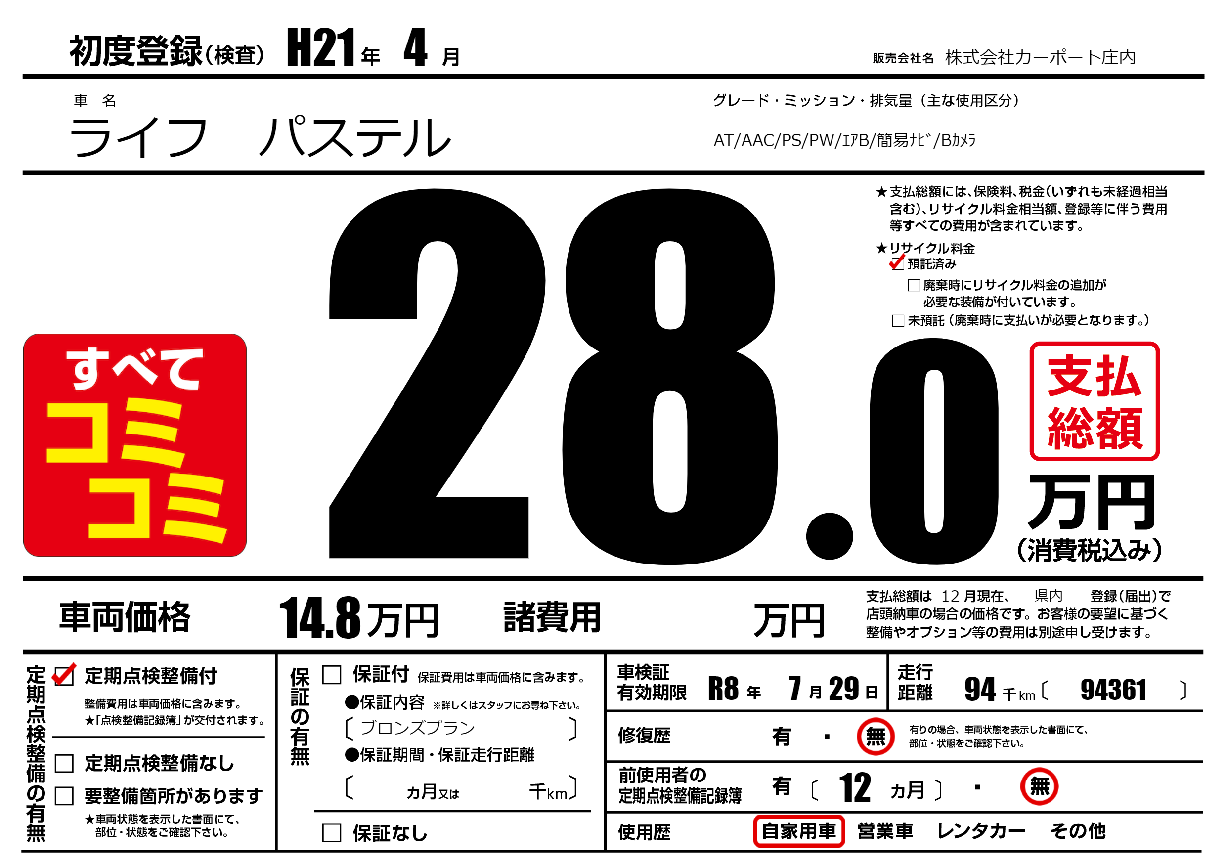 | 車名 | ライフ パステル | グレード ミッション 排気量 |