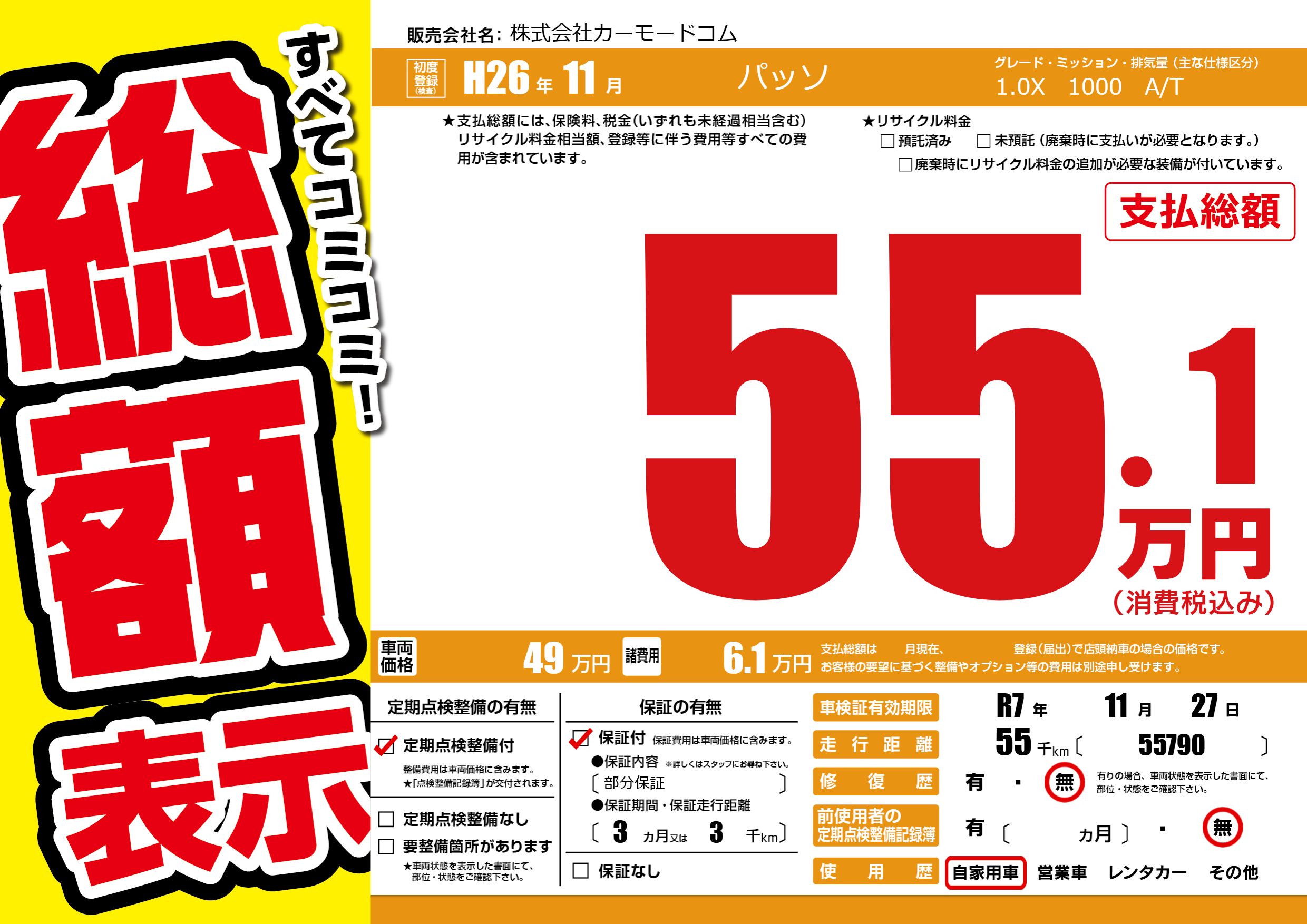 | 車名 | パッソ | グレード ミッション 排気量 |