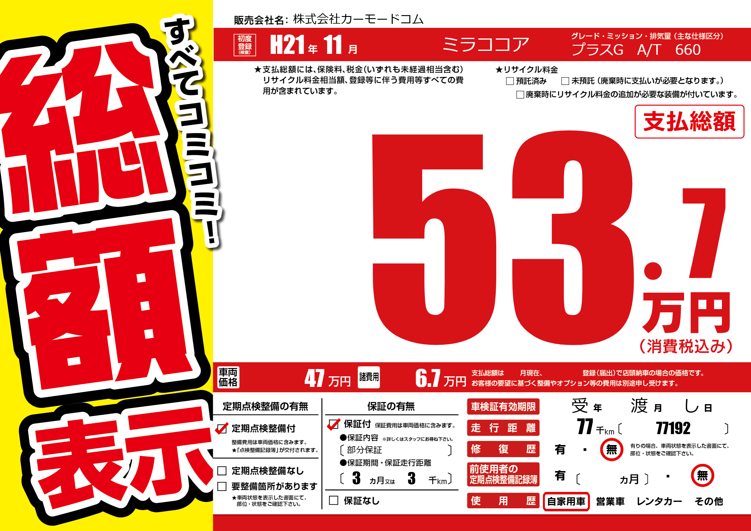 | 車名 | ミラココア | グレード ミッション 排気量 |