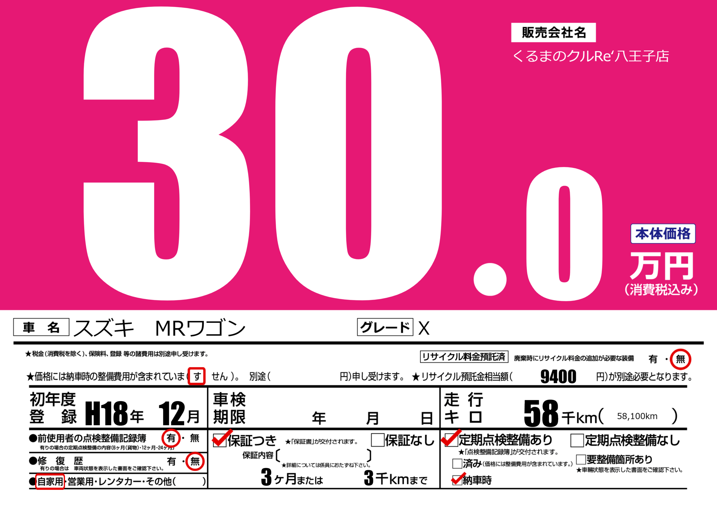| 車名 | スズキ MRワゴン | グレード ミッション 排気量 |