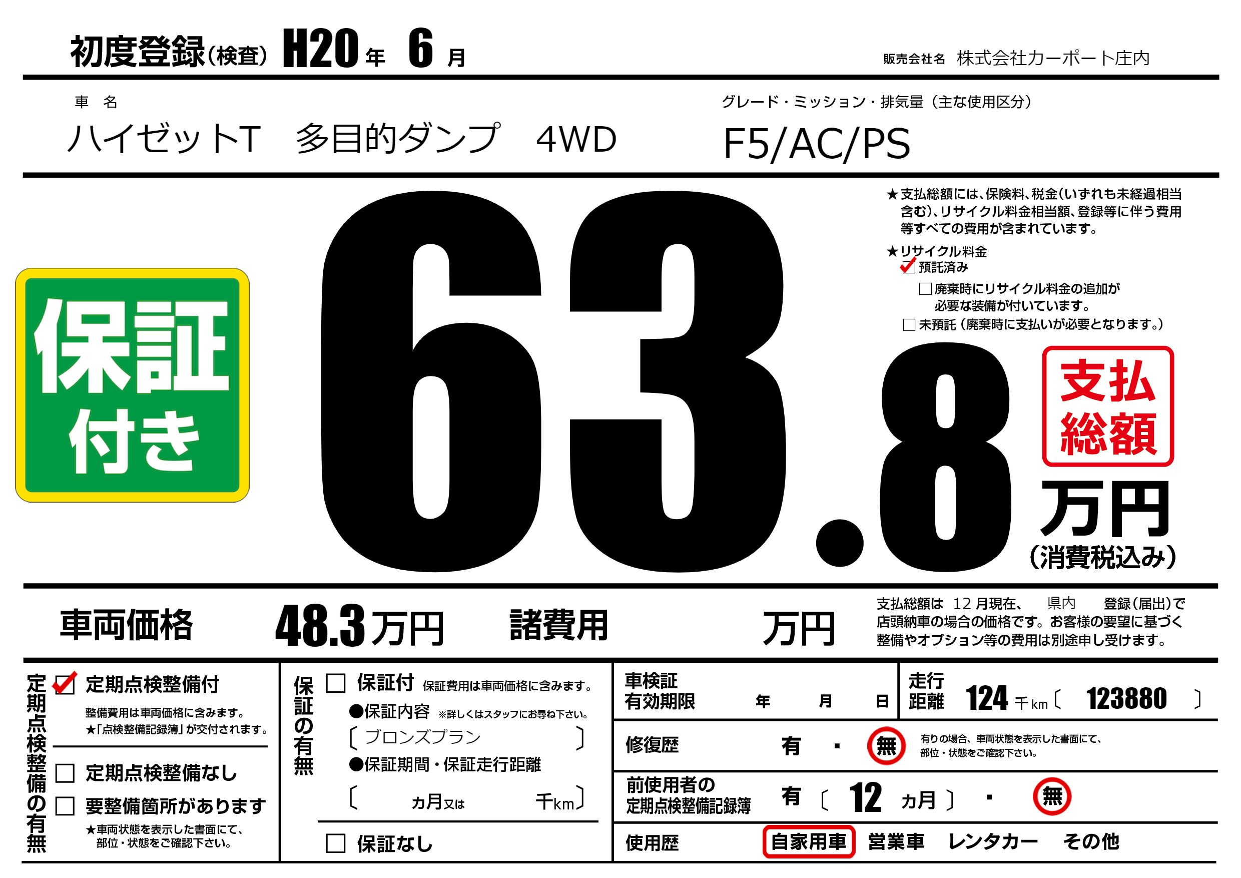 | 車名 | ハイゼットT 多目的ダンプ 4WD | グレード ミッション 排気量 |