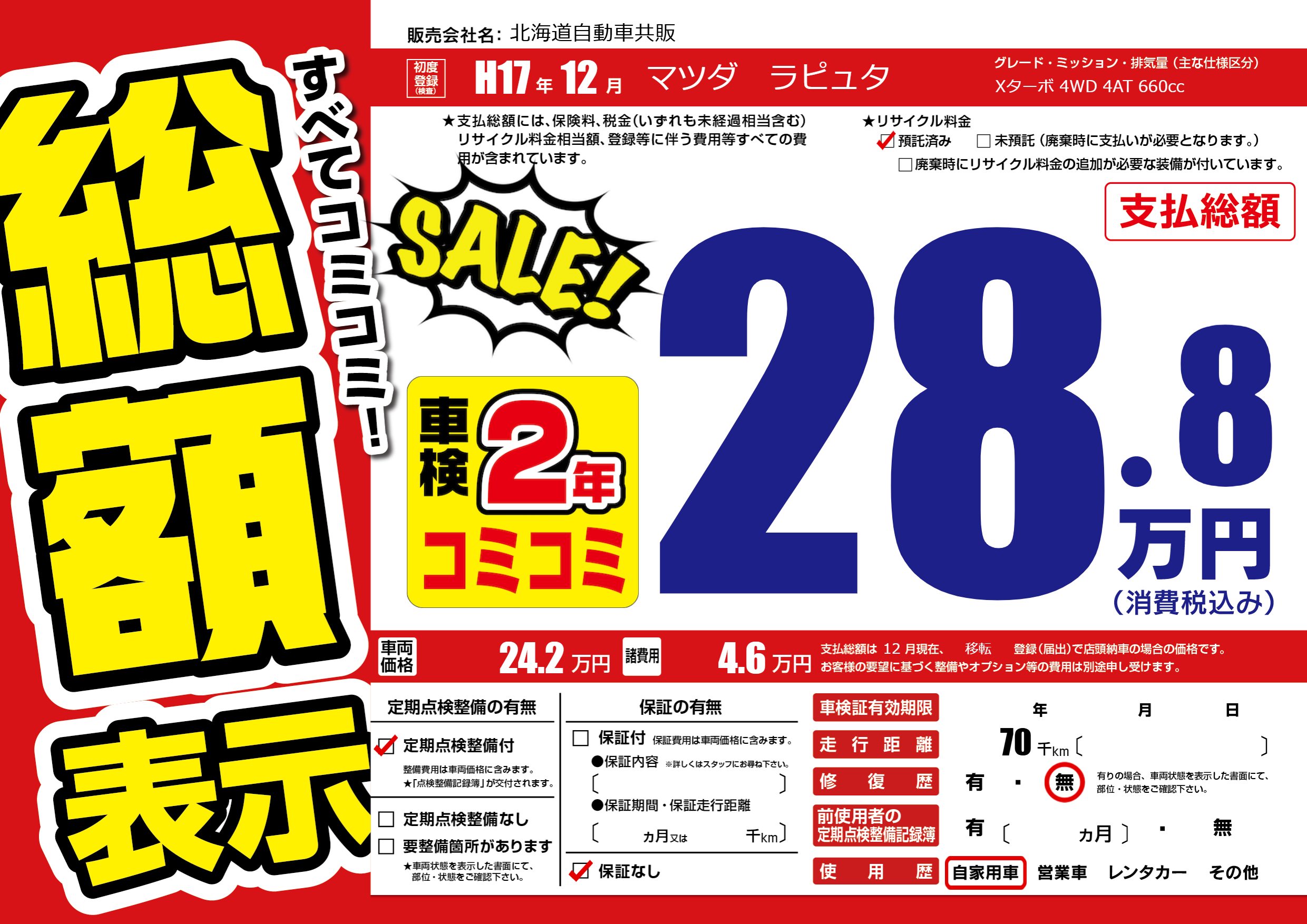 | 走行キロ | 7万km | 初年度登録 | H17年12月 |