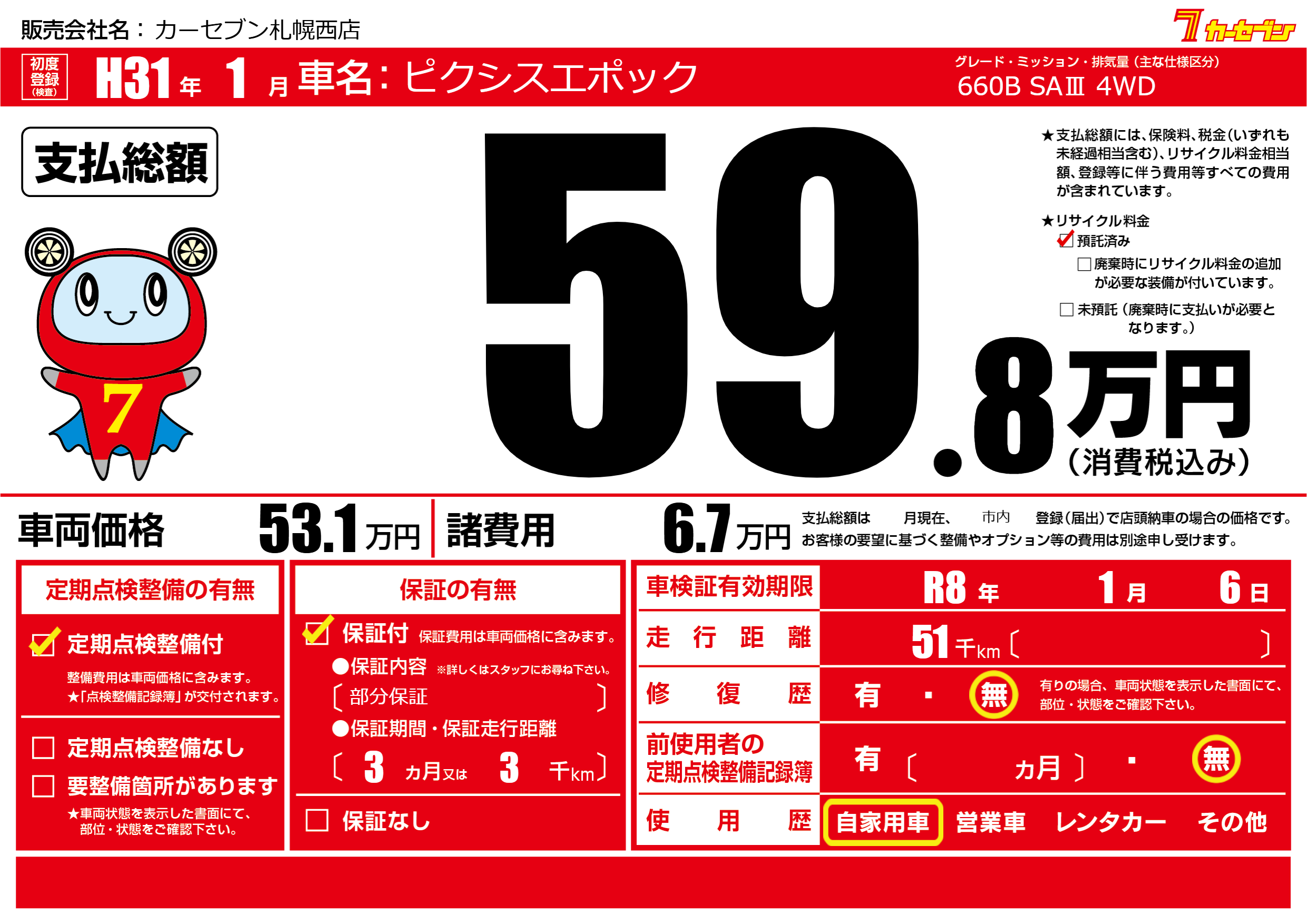 | 走行キロ | 5.1万km | 初年度登録 | H31年1月 |