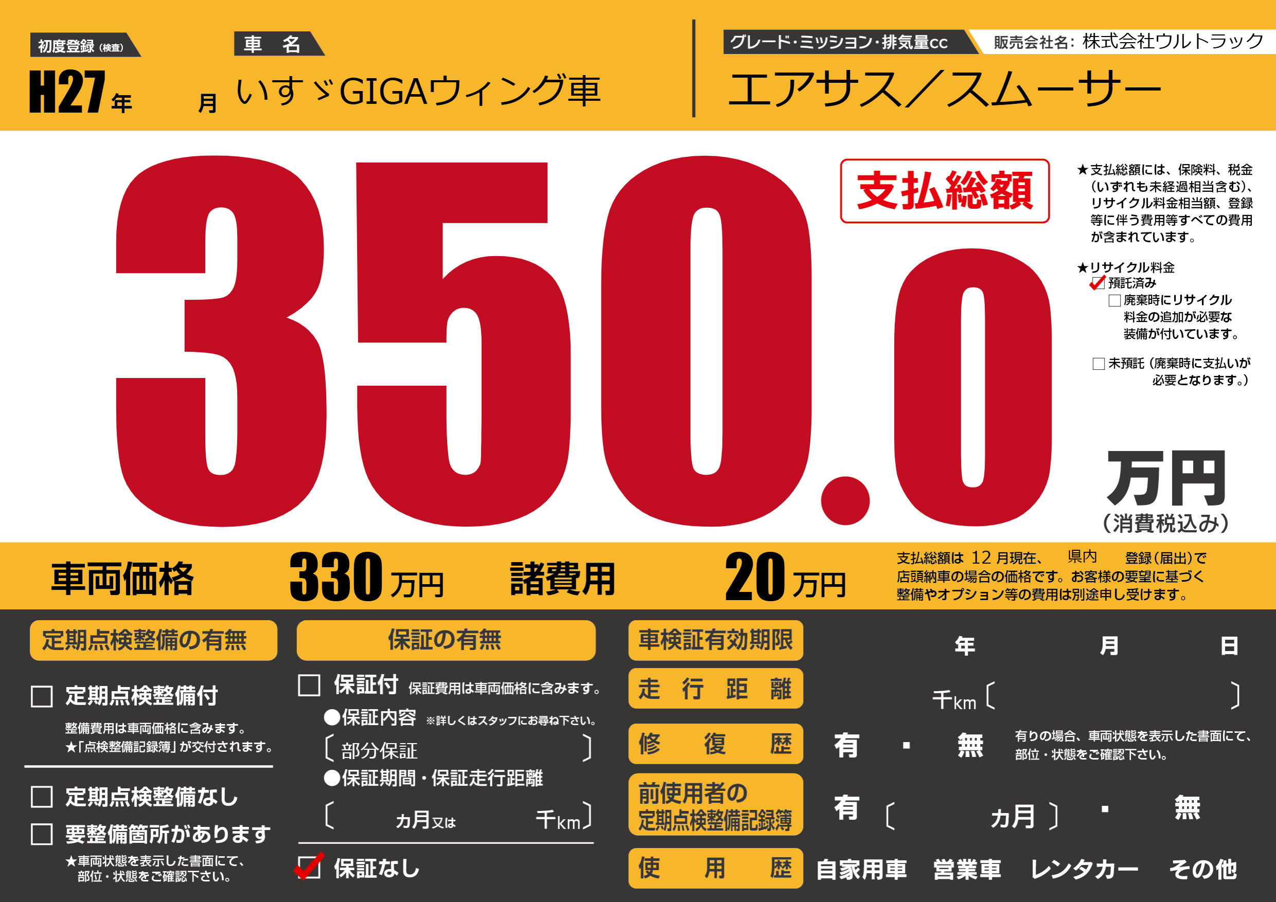 | 車名 | いすゞGIGAウィング車 | グレード ミッション 排気量 |