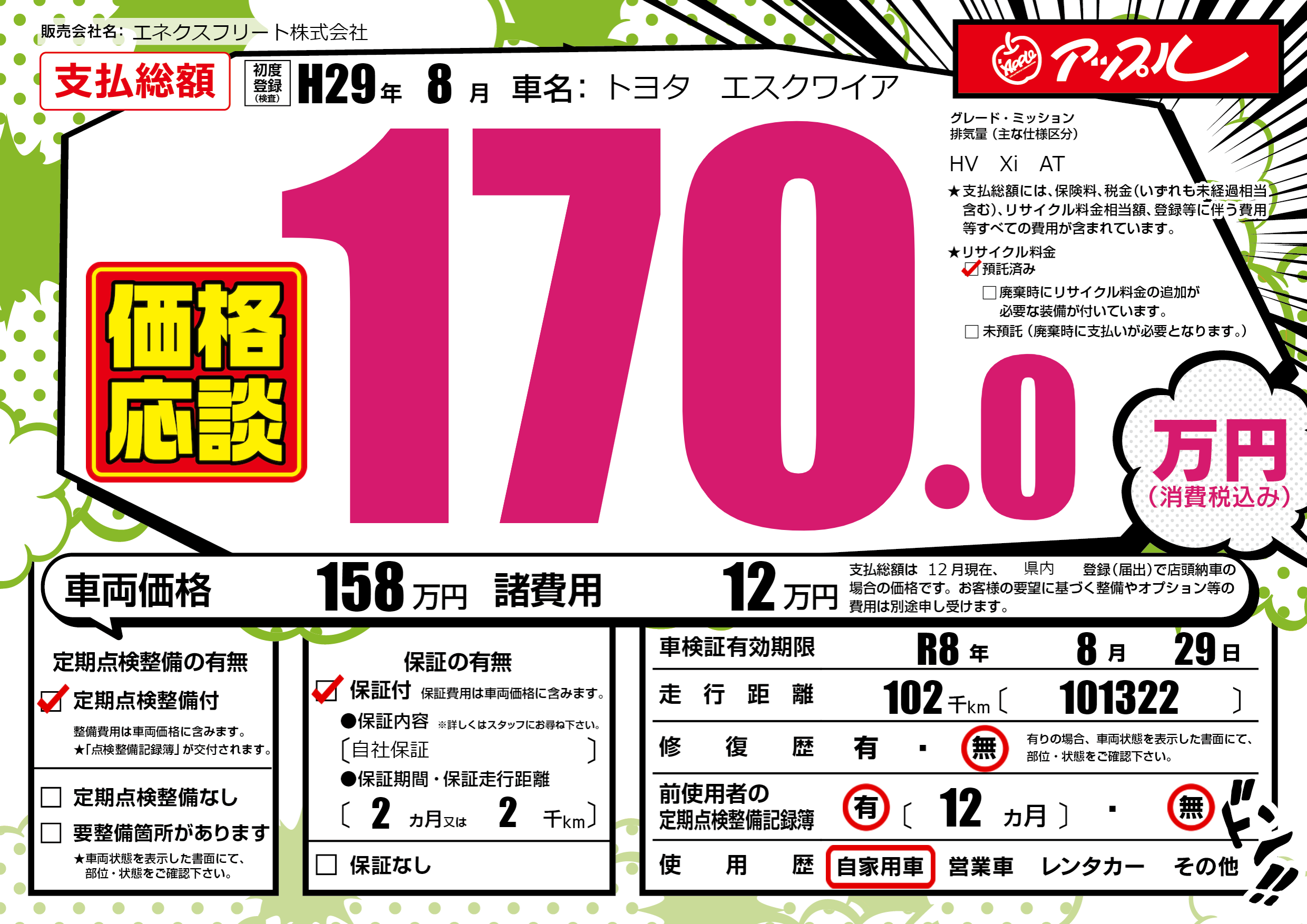 | 走行キロ | 10.2万km | 初年度登録 | H29年8月 |
