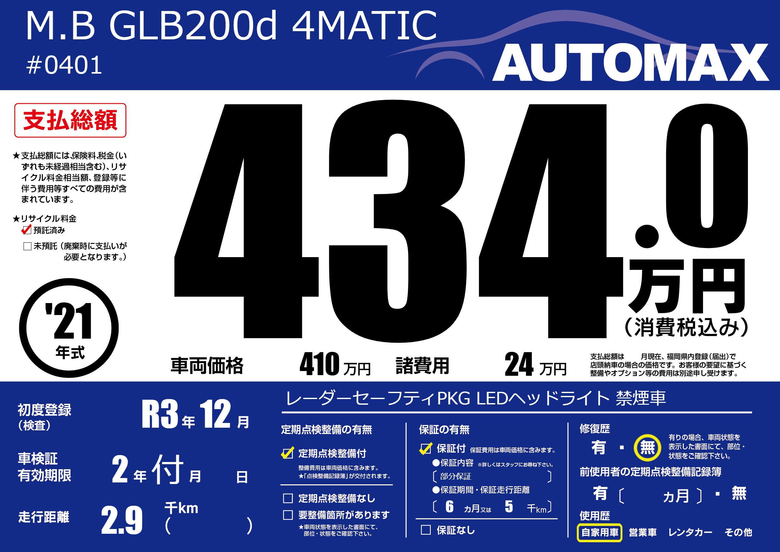 | 車名 | M.B GLB200d 4MATIC | グレード ミッション 排気量 |
