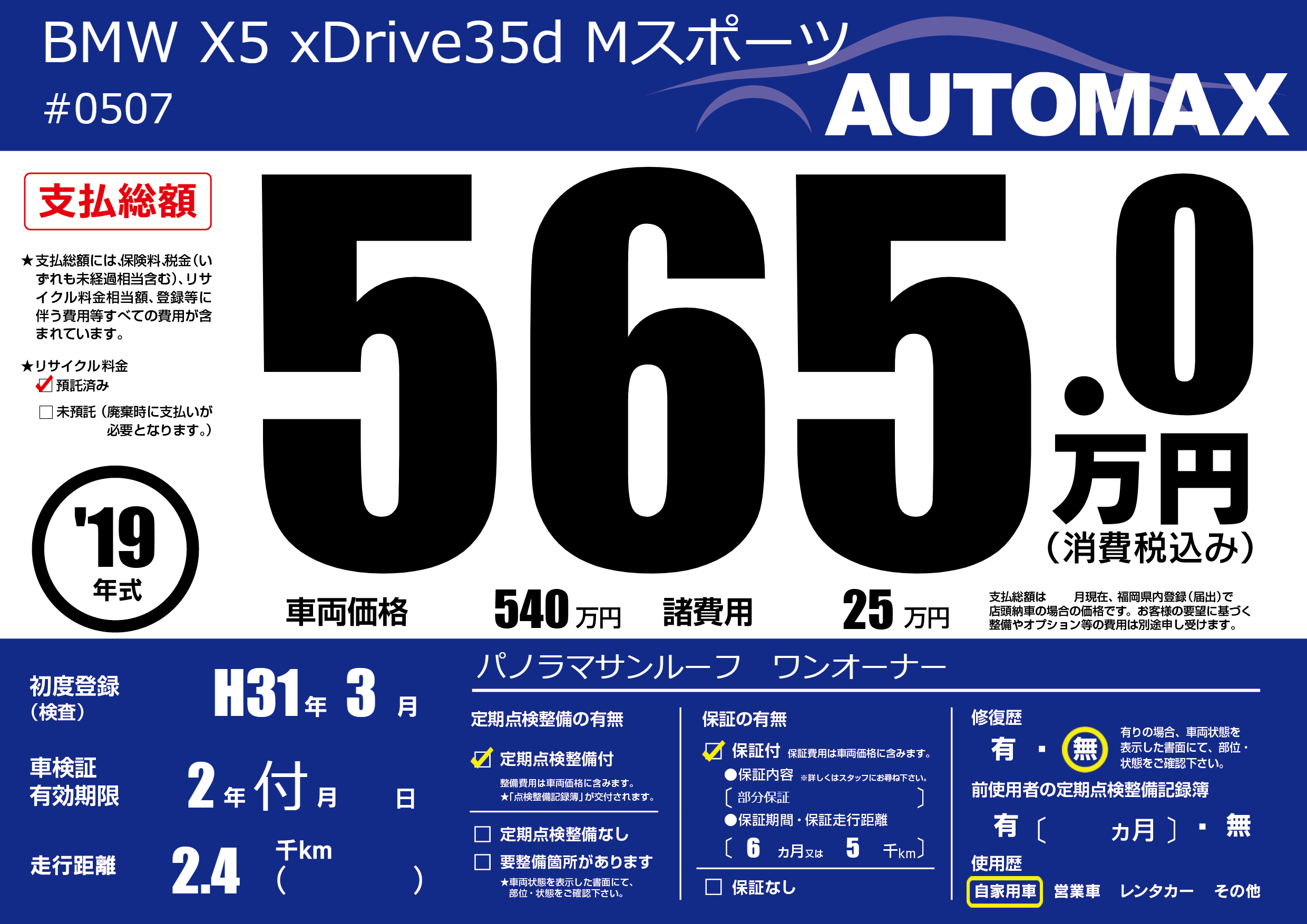 | 車名 | BMW X5 xDrive35d Mスポーツ | グレード ミッション 排気量 |