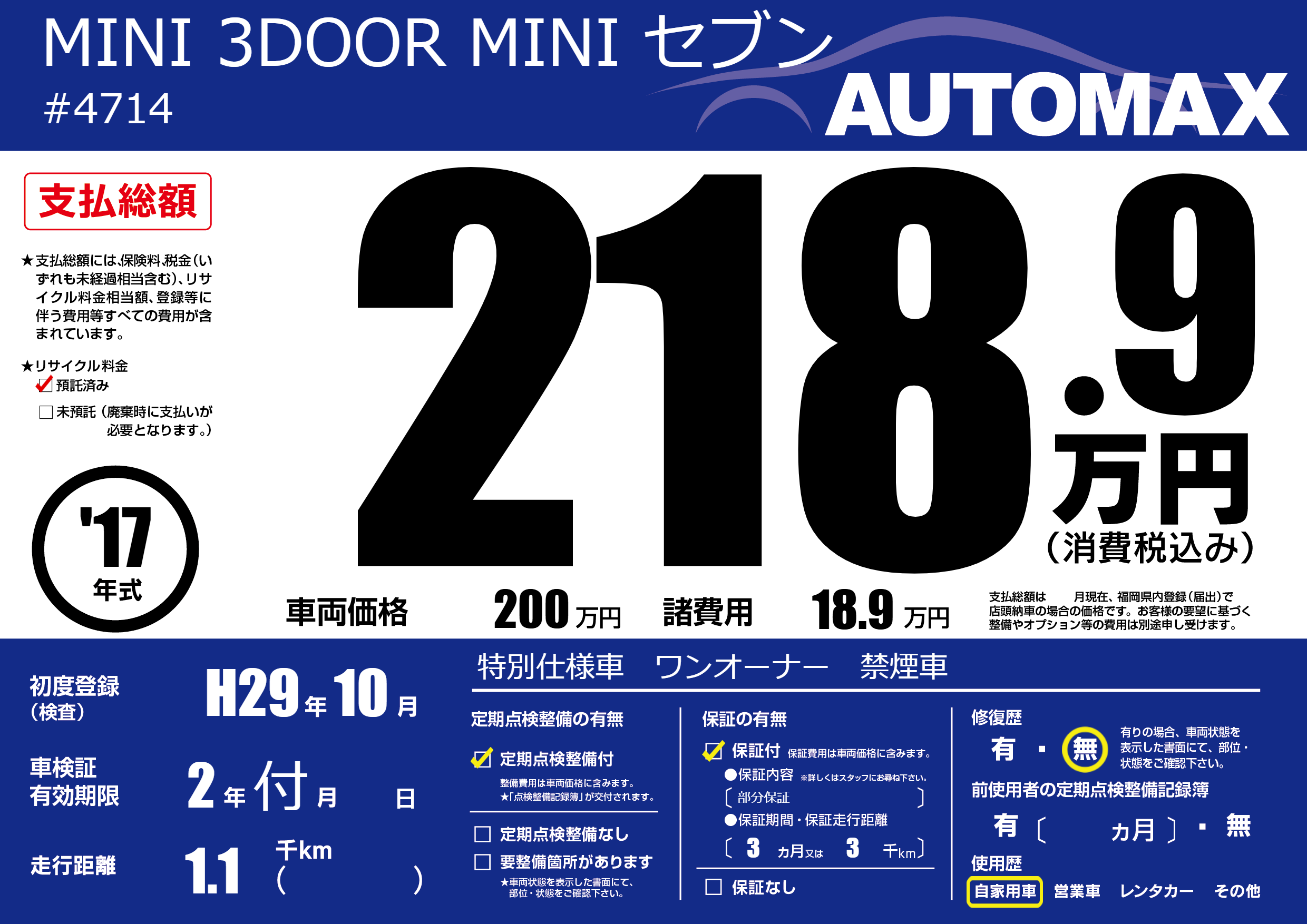 | 走行キロ | 0.1万km | 初年度登録 | H29年10月 |