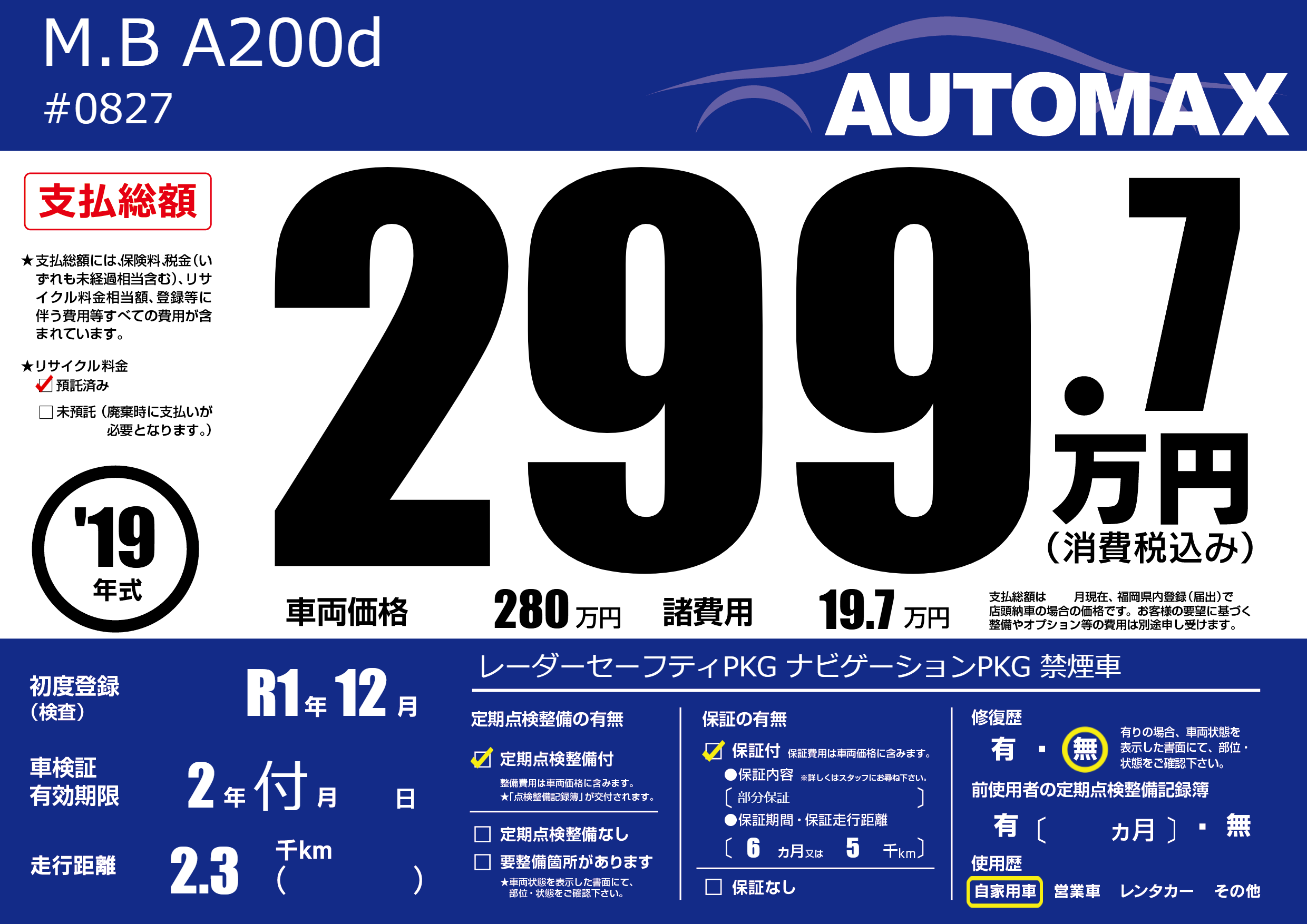| 車名 | M.B A200d | グレード ミッション 排気量 |