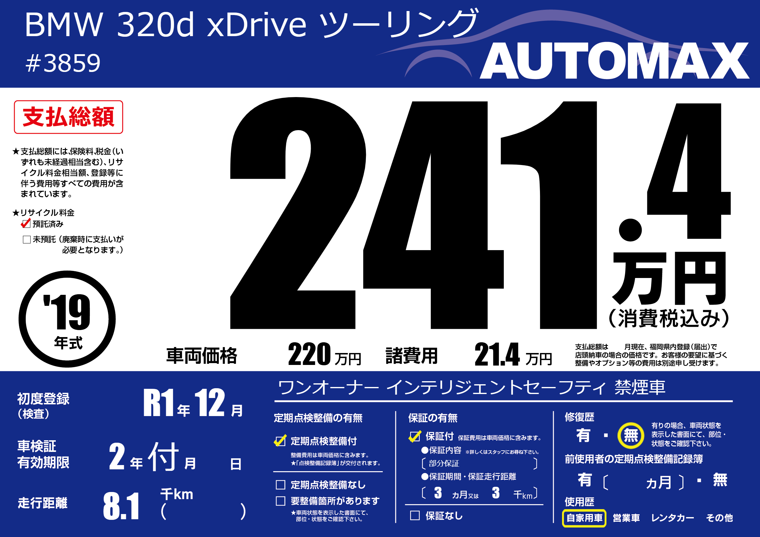 | 車名 | BMW 320d xDrive ツーリング | グレード ミッション 排気量 |