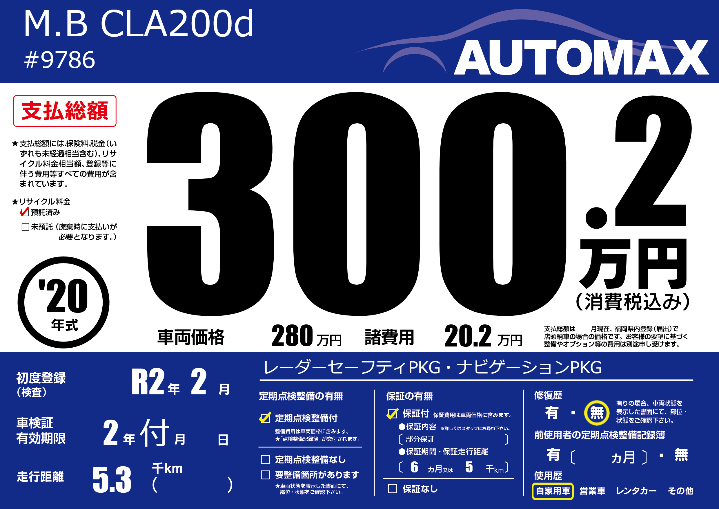 | 車名 | M.B CLA200d | グレード ミッション 排気量 |