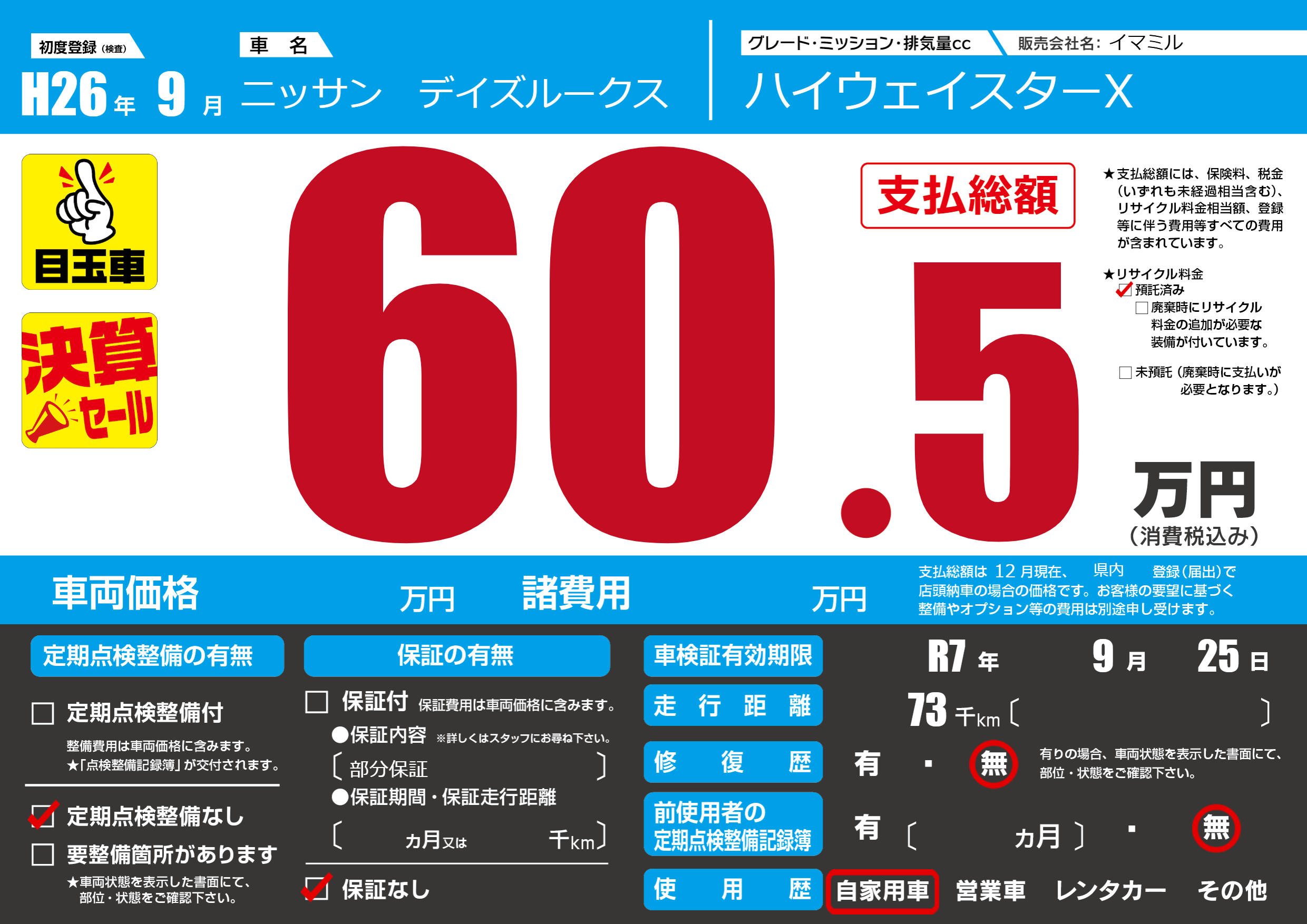 | 走行キロ | 7.3万km | 初年度登録 | H26年9月 |