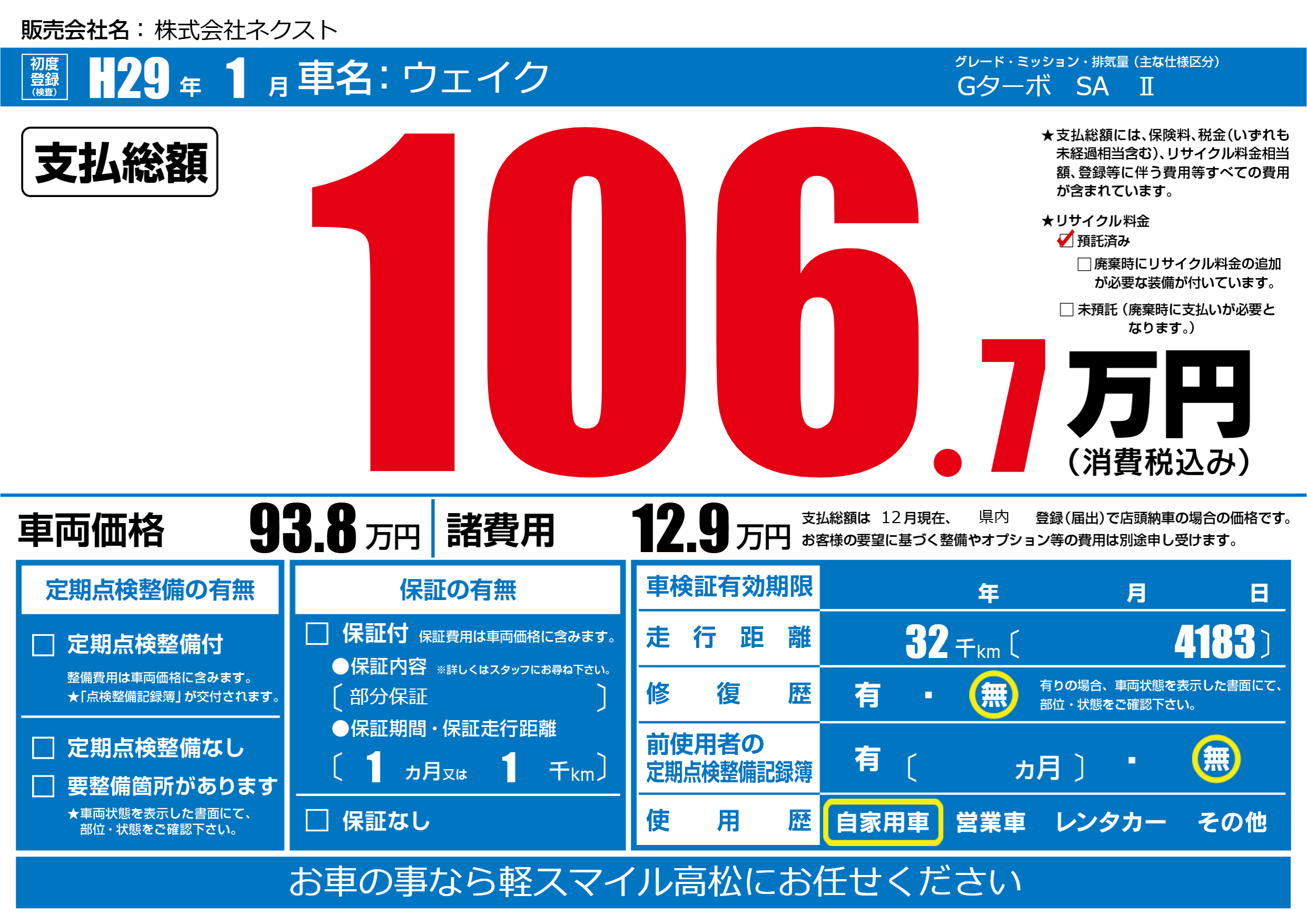 | 車名 | ウェイク | グレード ミッション 排気量 |