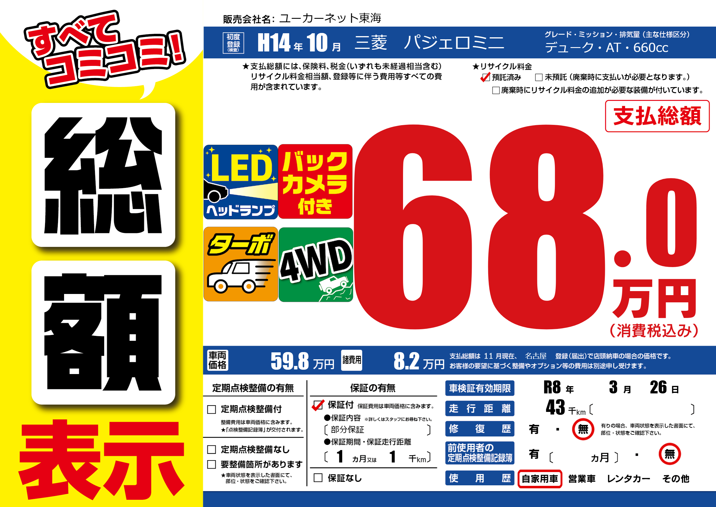 | 車名 | 三菱 パジェロミニ | グレード ミッション 排気量 |