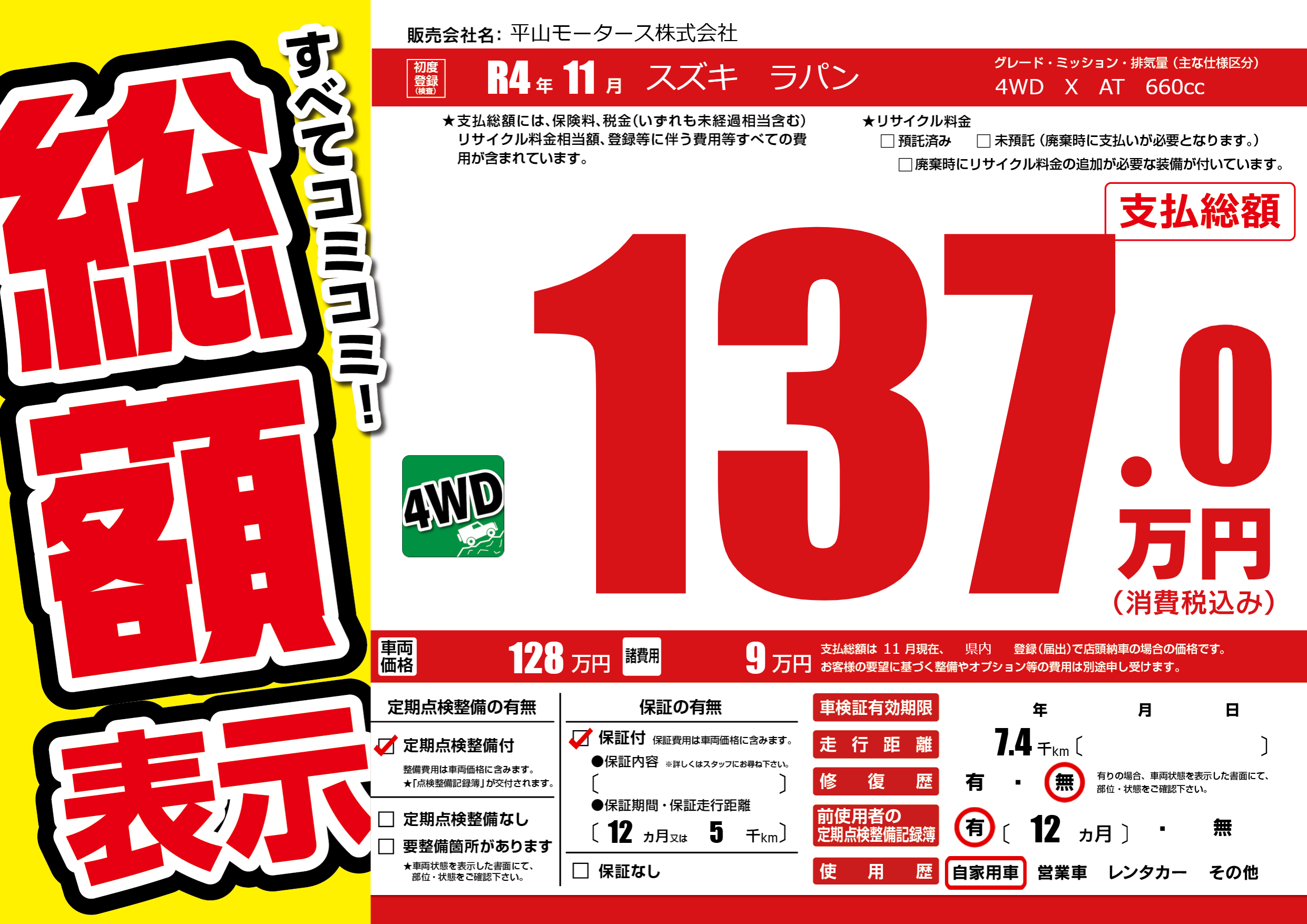 | 走行キロ | 0.7万km | 初年度登録 | R4年11月 |