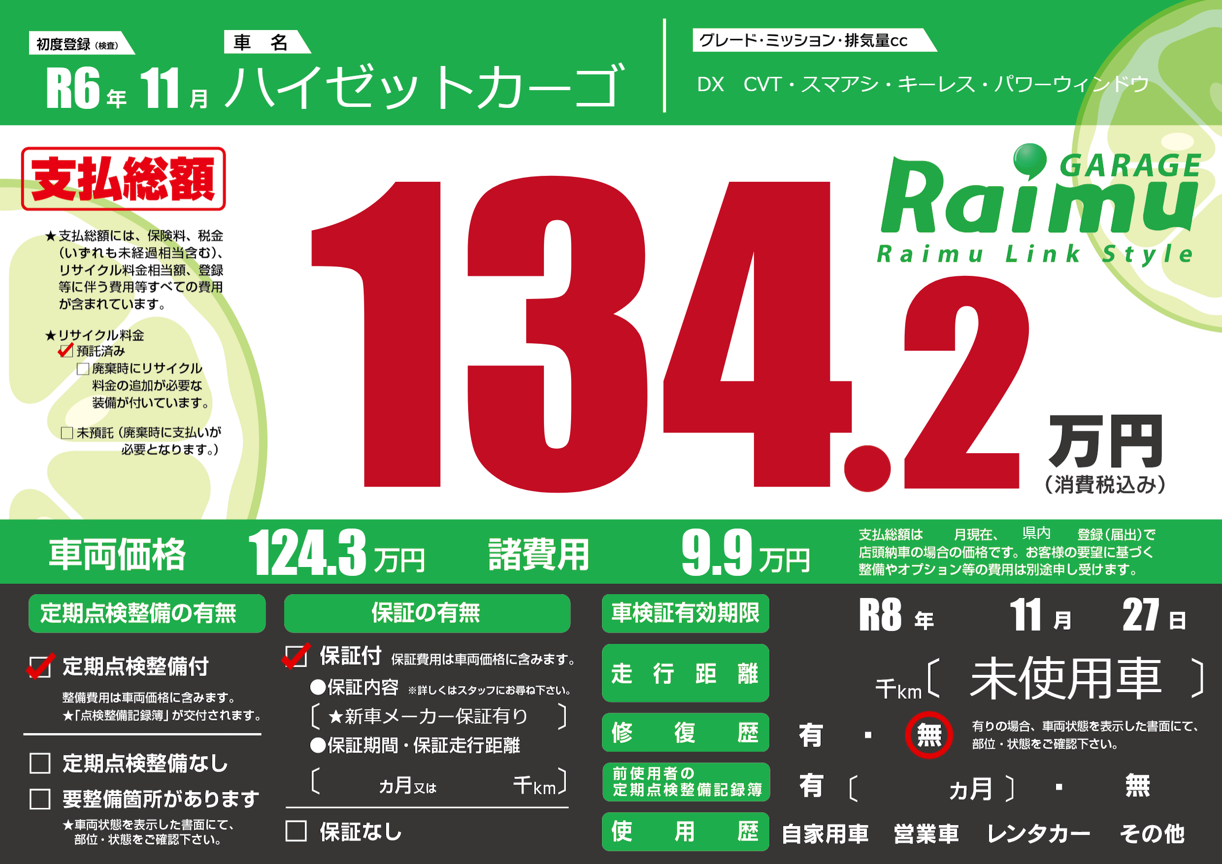| 車名 | ハイゼットカーゴ | グレード ミッション 排気量 |