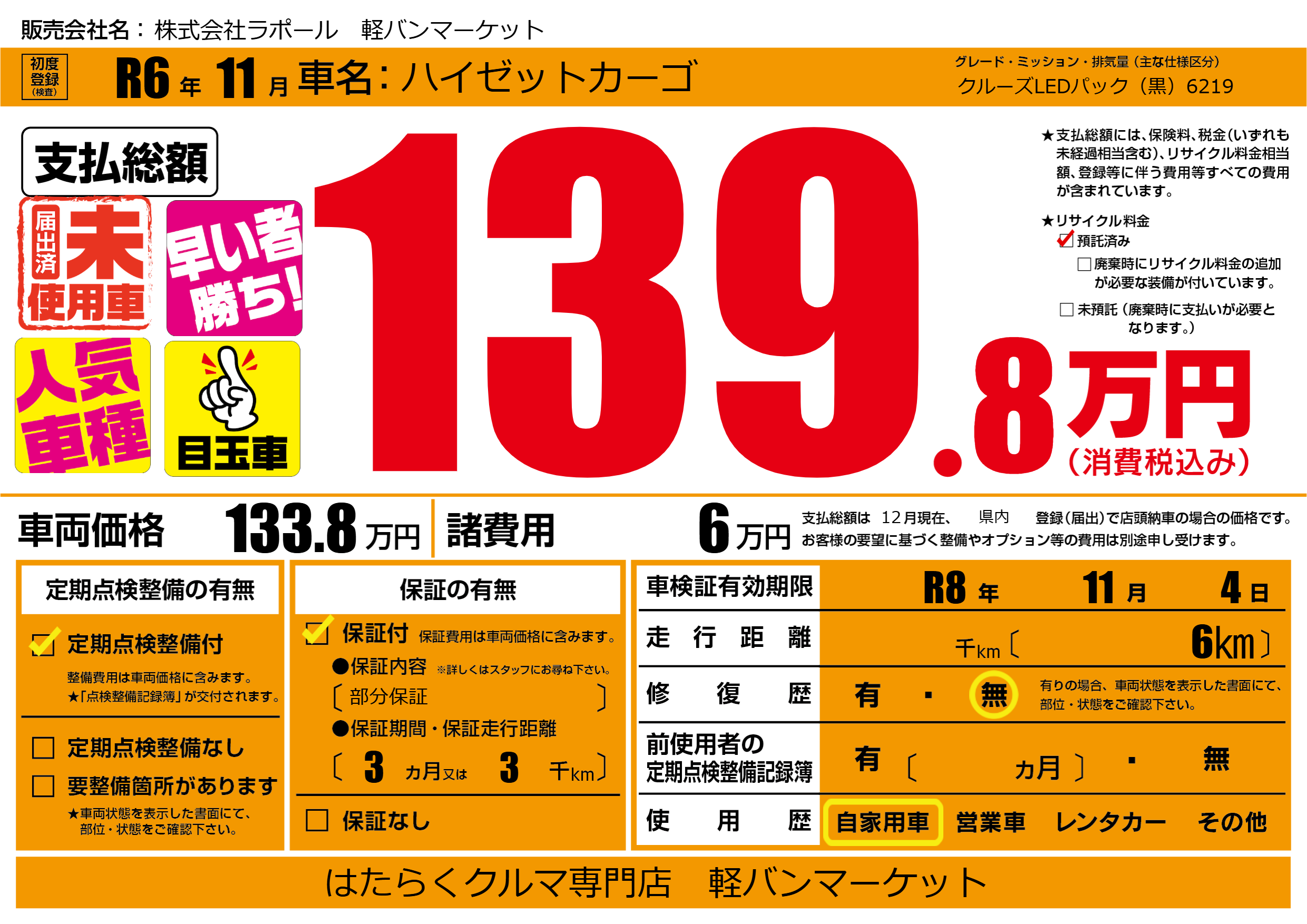 | 走行キロ | - | 初年度登録 | R6年11月 |