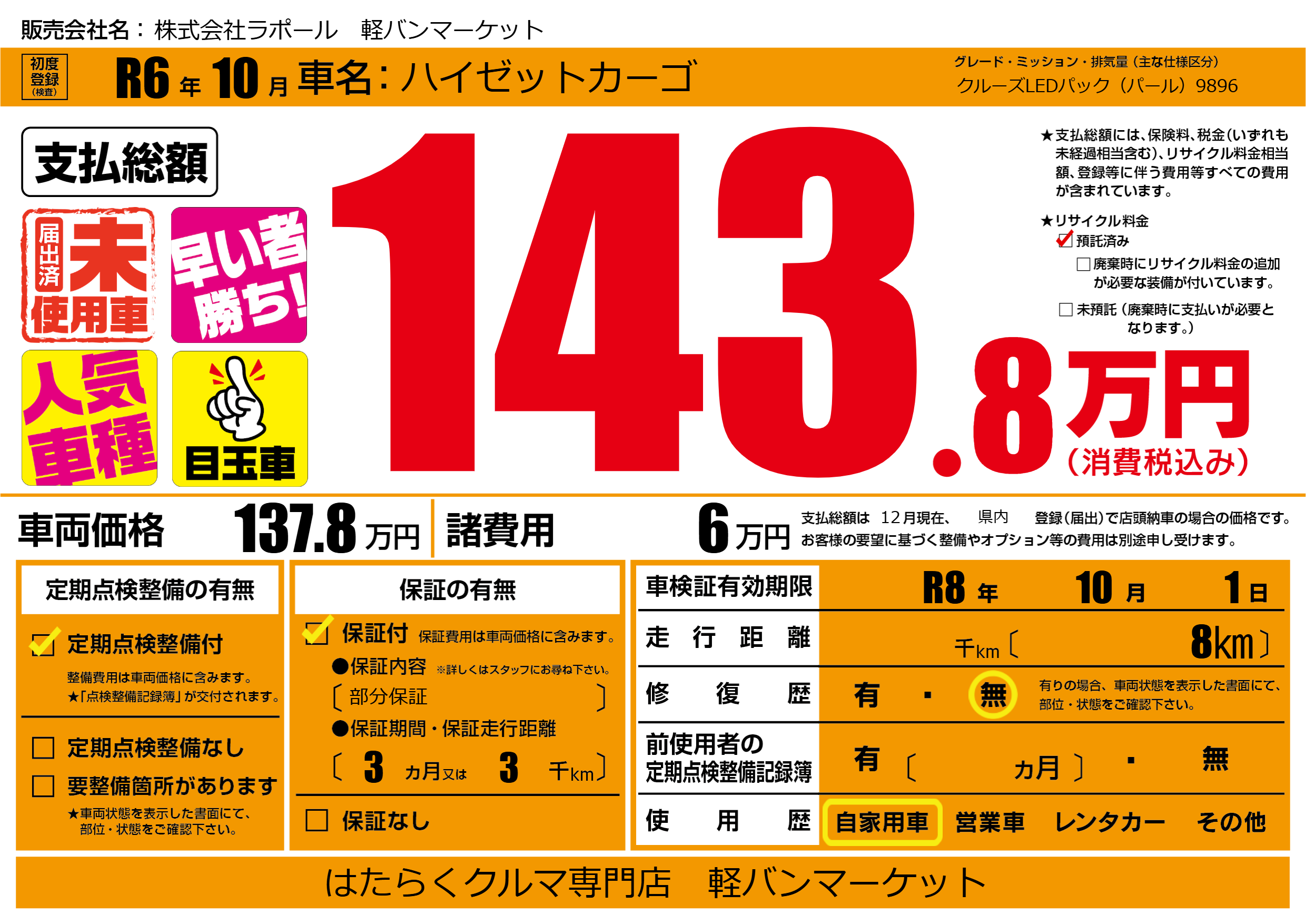 | 車名 | ハイゼットカーゴ | グレード ミッション 排気量 |
